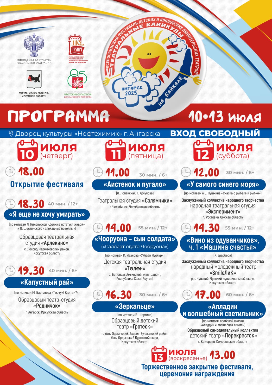 В программе «Театральных каникул на Байкале»: торжественные церемонии открытия и закрытия фестиваля, четыре дня конкурсных просмотров, творческая лаборатория для руководителей детских и юношеских любительских театров с обсуждением и разбором представленных спектаклей.