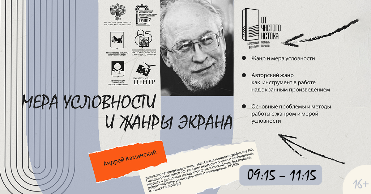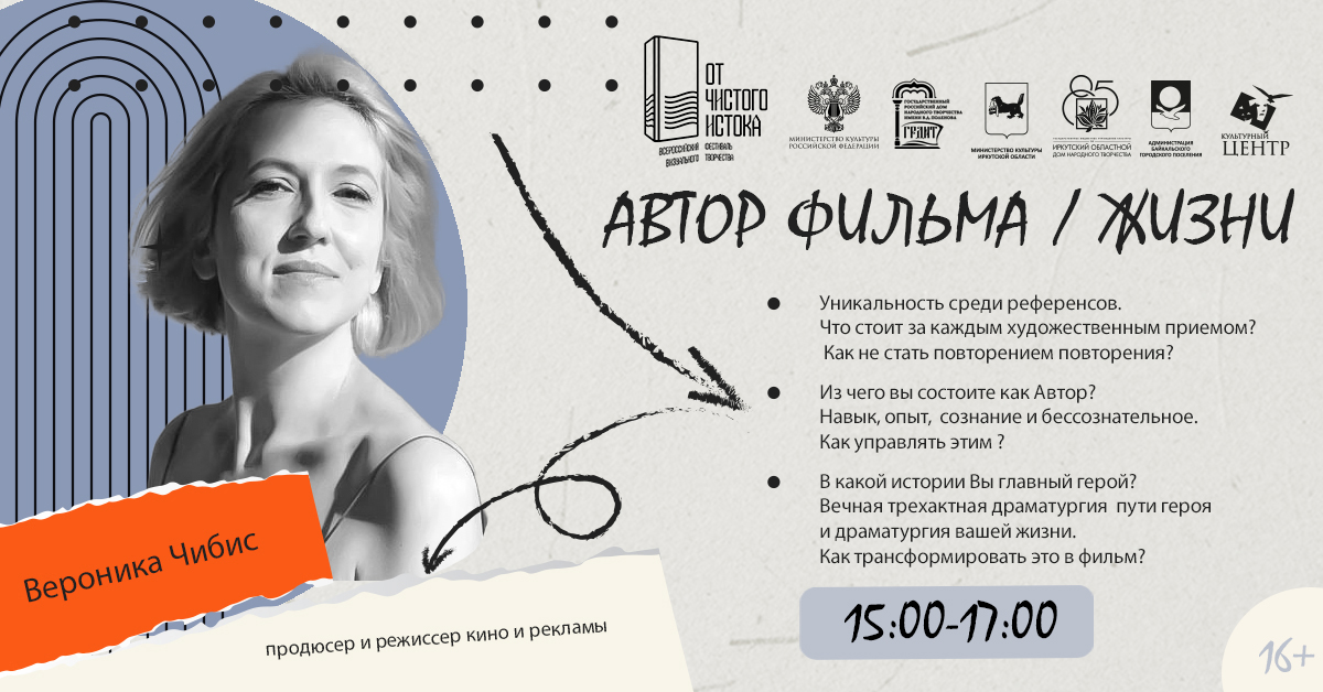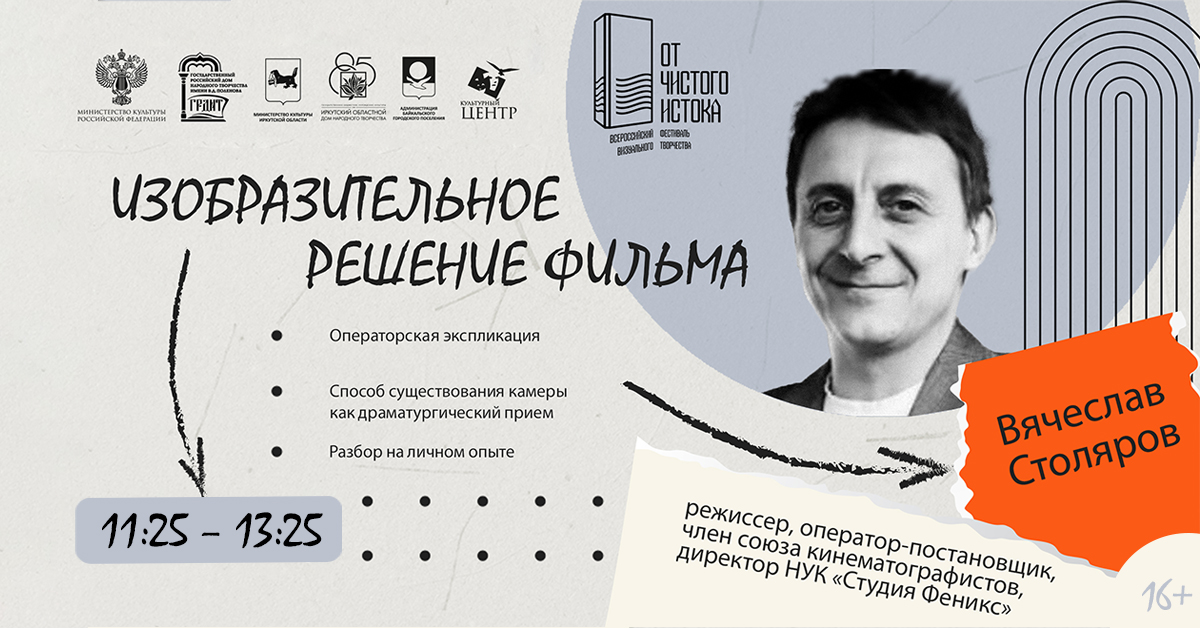 2 октября в малом театральном зале МКЦ г. Байкальска Андрей Станиславович Каминский с 9:15 до 11:15 раскроет тему «Мера условности и жанры экрана». В 11:25 спикера сменит известный иркутский режиссёр, оператор-постановщик, член Союза кинематографистов России Вячеслав Столяров. В течение двух часов он обсудит с коллегами изобразительные решения при создании фильма. В 15:00 Вероника Чибис проведёт для участников фестиваля лекцию-погружение «Автор фильма/жизни». Все лекции в прямом эфире будут транслироваться на интернет-площадке фестиваля «От чистого истока» и в госпаблике Иркутского областного Дома народного творчества (https://vk.com/iodnt).