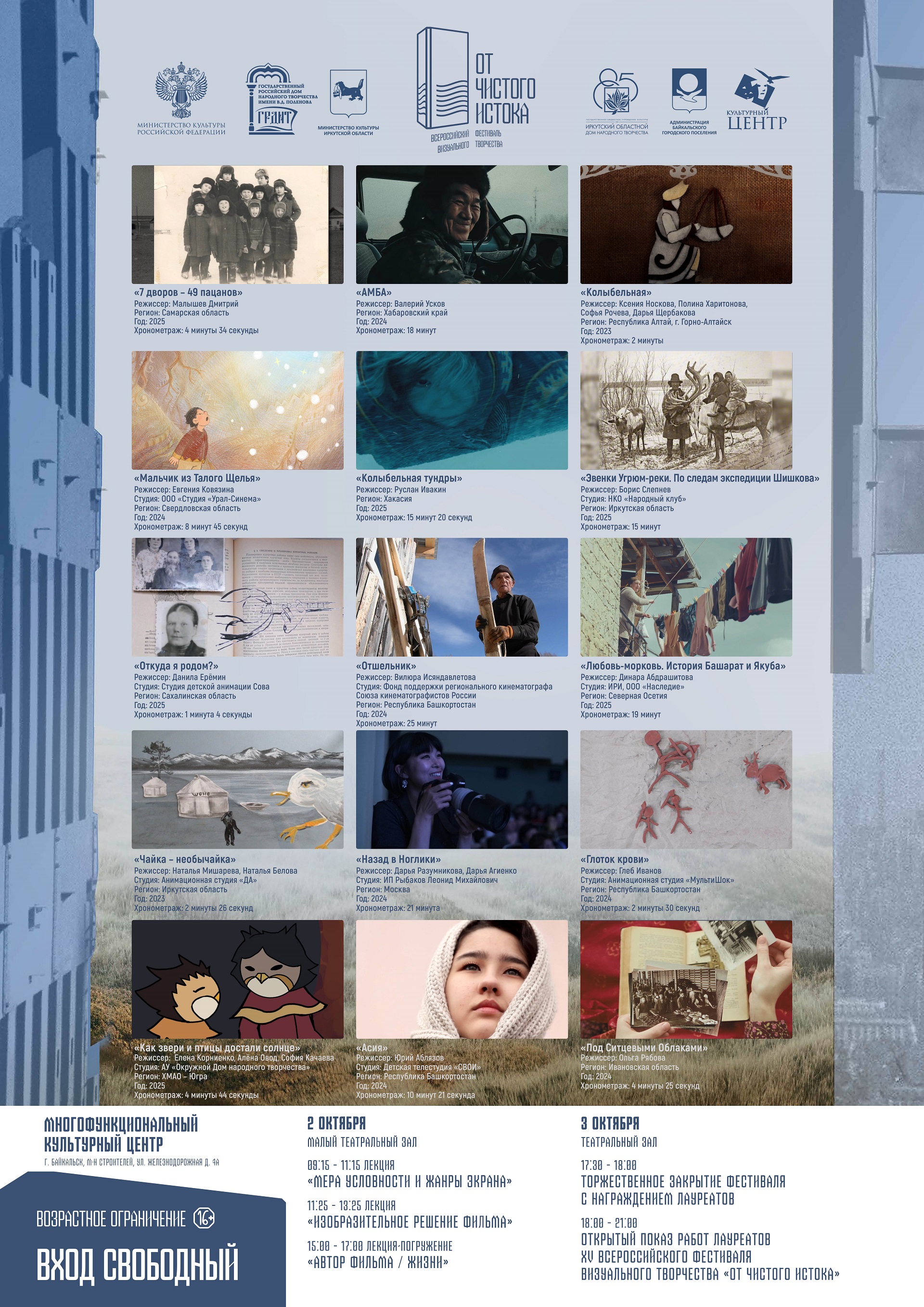 Награждение лауреатов и показ 15 лучших работ юбилейного фестиваля «От чистого истока» состоится 3 октября в 17:30 в театральном зале Многофункционального культурного центра г. Байкальска (мкр-н Строителей, ул. Железнодорожная, 4 А). Аннотации фильмов здесь.
