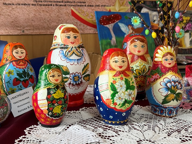 В организации выставки декоративно-прикладного творчества приняли участие: Оксана Прусенкова с выставкой кукол; Светлана Воронова с выставкой национальных кукол; студия «Мастерская чудес» со своими работами; Екатерина Карпова, представившая цветочные композиции, выполненные в различных техниках. Кроме того, были представлены изделия из бересты, картины, плетеные корзины и матрешки.