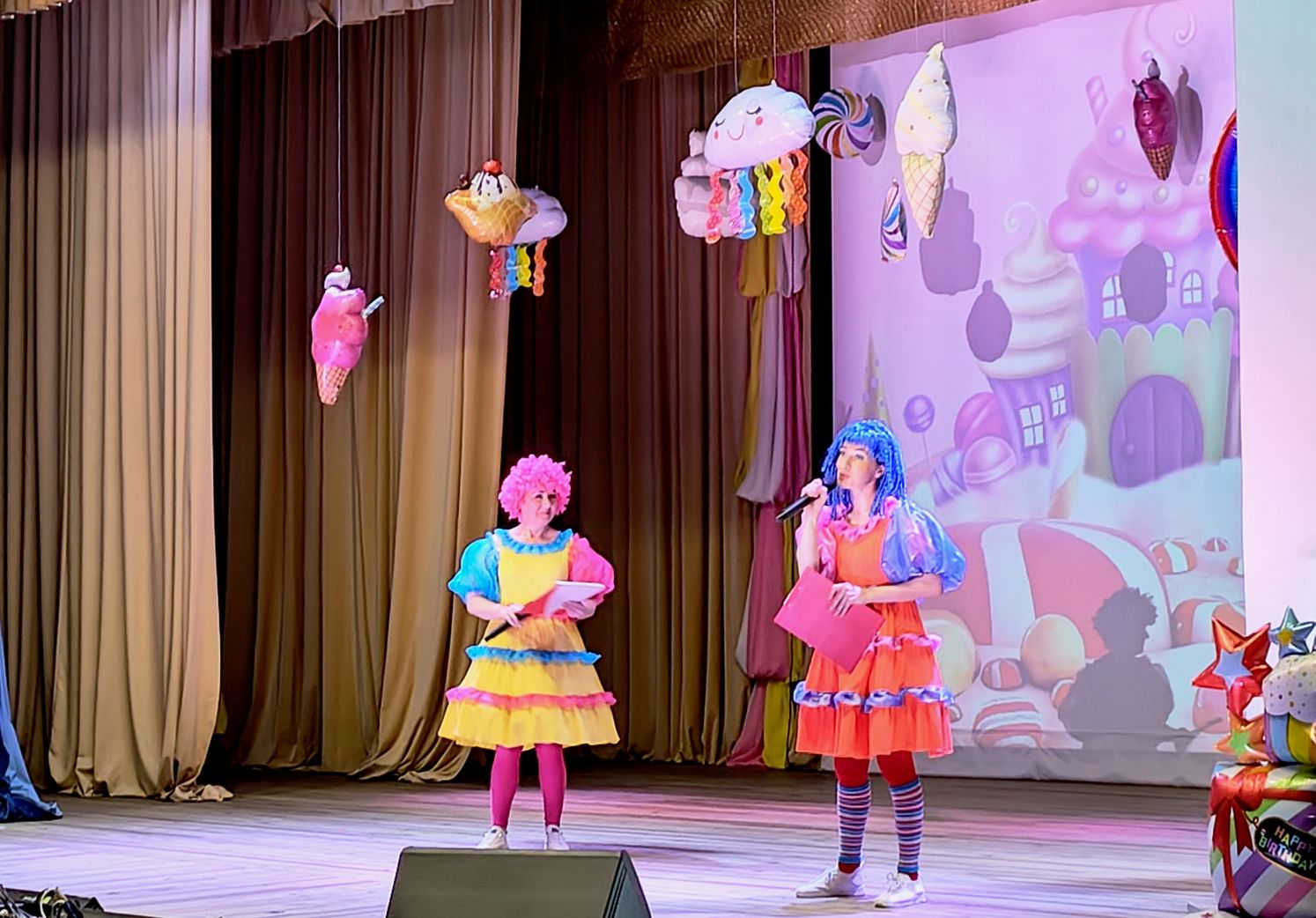 Ведущие в образе веселых подружек Кислинки и Сластены поприветствовали гостей, поздравили с началом летних каникул, пожелали прекрасного отдыха и пригласили взрослых и детей в страну «Карамелию», жители которой очень любят играть, танцевать, петь и отгадывать загадки. Ребята вместе со взрослыми с удовольствием отвечали на каверзные вопросы, выполняли задания, танцевали под зажигательную музыку, участвовали в веселых соревнованиях и конкурсах.