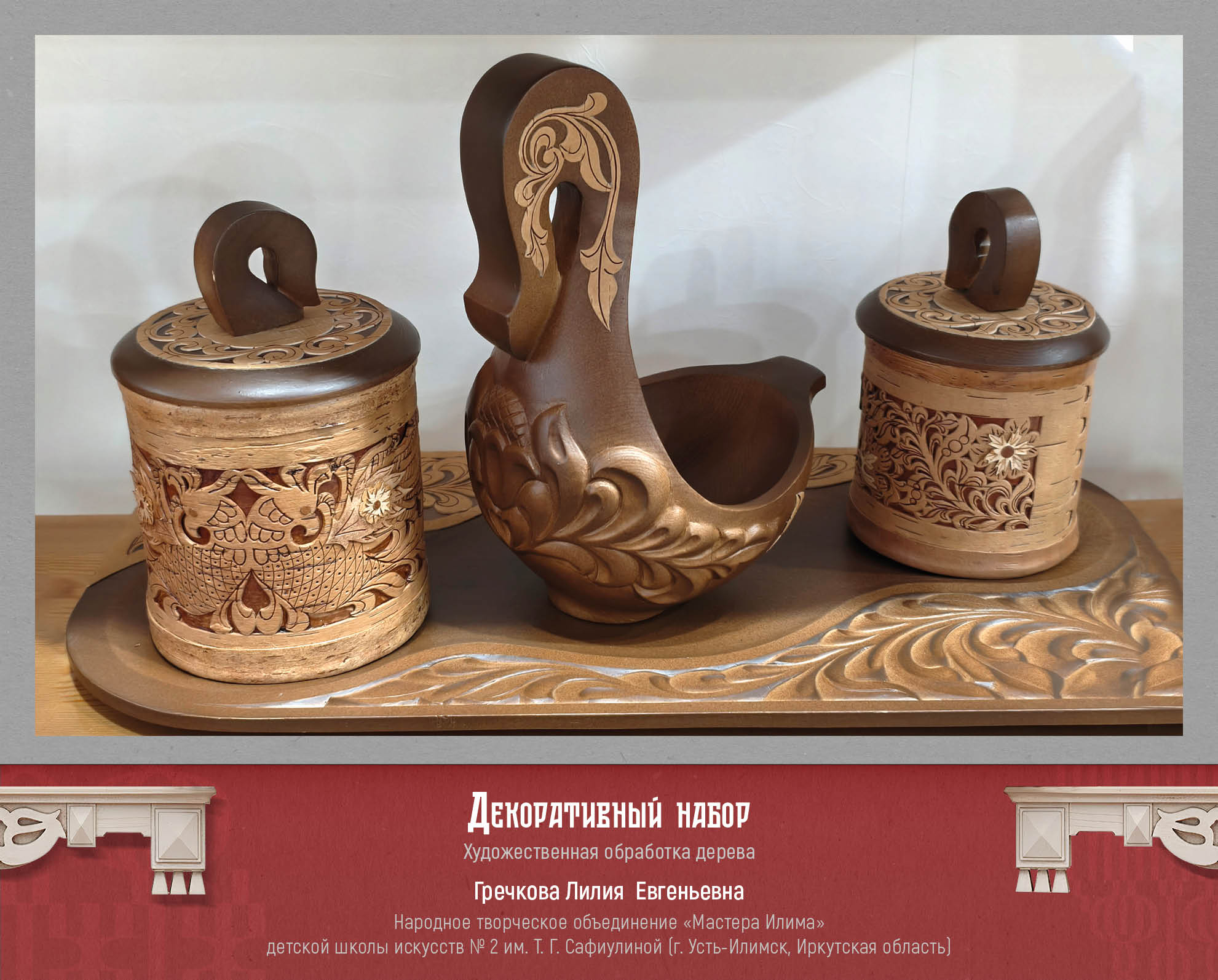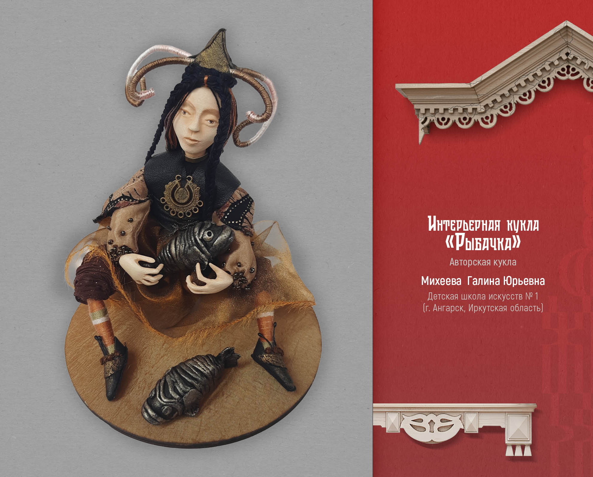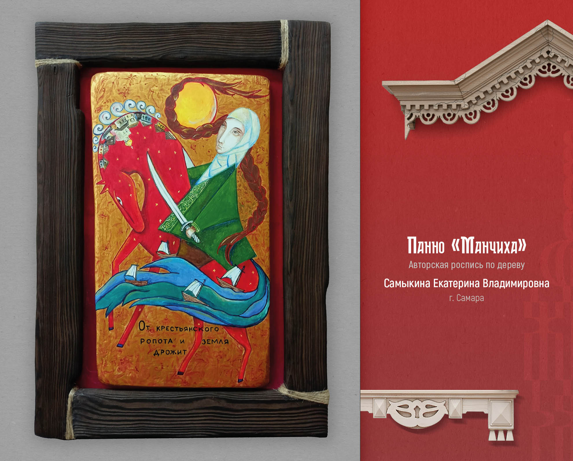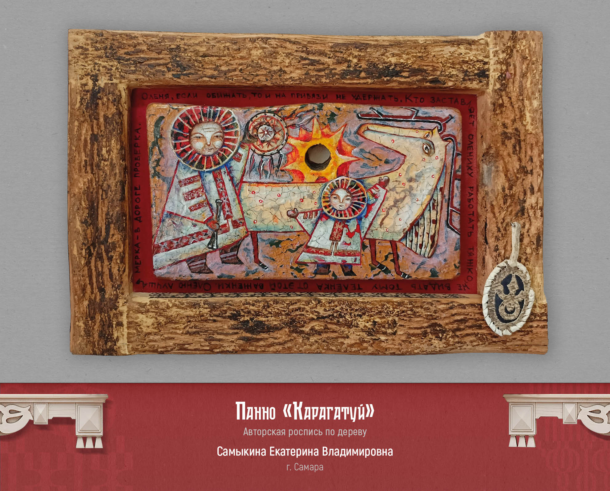 Художник, мастер из города Самара Екатерина Самыкина представила свою авторскую роспись по дереву. Декоративные панно, созданные по легендам и мифам разных народов. Одна из работ называется «Манчиха», и иллюстрирует легенду об атаманше вольных казаков. Автор описывает легенду и свою работу так: «Трудовые люди у Манчихи защиты от господ просили. А сама атаманша сказывала: — Хотелось бы мне видеть Волгу вольной рекой. Царство видеть в Жигулях без бар, царей и кормщиков. Ведь сколько кладут труда люди для господ, а сами в нищенстве живут да долю горькую свою клянут, а какая в людях сила! И отвагой, и справедливостью, и красотой наградила молва свою заступницу. Сказывали, что ходит она в широких казацких шароварах, красном кафтане из парчи и в такой же красной шапке. Даже конь ее, и тот красной масти. Изгиб шеи коня символизирует гору, на которой стояла вольница Манчихи. Поселение перевернуто - оно не сохранилось до наших дней. Грива коня выполнена в виде облаков-высоко над Волгой расположились казаки. Хвост коня - река Волга, вдоль берегов которой тянули бурлаки барки. «От крестьянского ропота и земля дрожит». Эта пословица отражает силу и потенциал недовольства крестьян. Давно это было. Зато в памяти людской волжанка навеки осталась. А та гора, что стоит вблизи села Подгоры, и доселе зовется всеми Манчихой». Еще одна работа Екатерины называется «Кильвей», рассказывает о празднике молодого оленя. Рождение оленя для оленевода – это большой праздник, символ жизни и возрождения. Старики говорили: будет олень, будет и жизнь. По внутреннему краю рамки изображен орнамент: Рога дикого оленя. По кругу панно написаны традиционные пословицы, связанные с оленями. На раме прикреплен брелок ручной работы, сшитый вручную из кожи рыб: тайменя и щуки. Еще один национальный праздник вдохновил автора на создание творческой работы – это традиционный башкирский и татарский праздник Каргатуй, посвященный встрече весны.