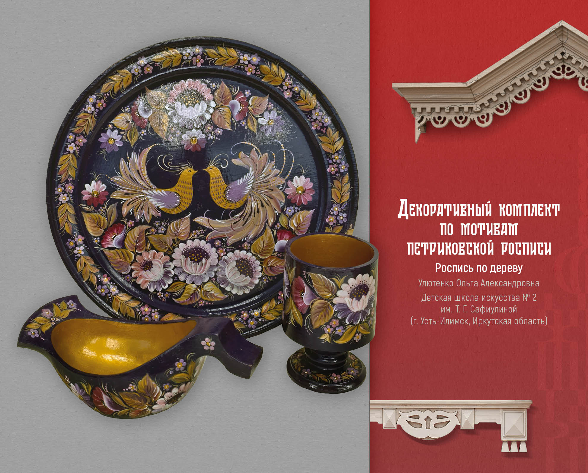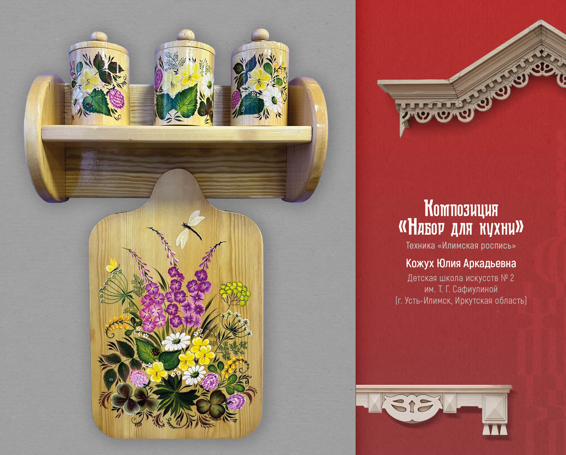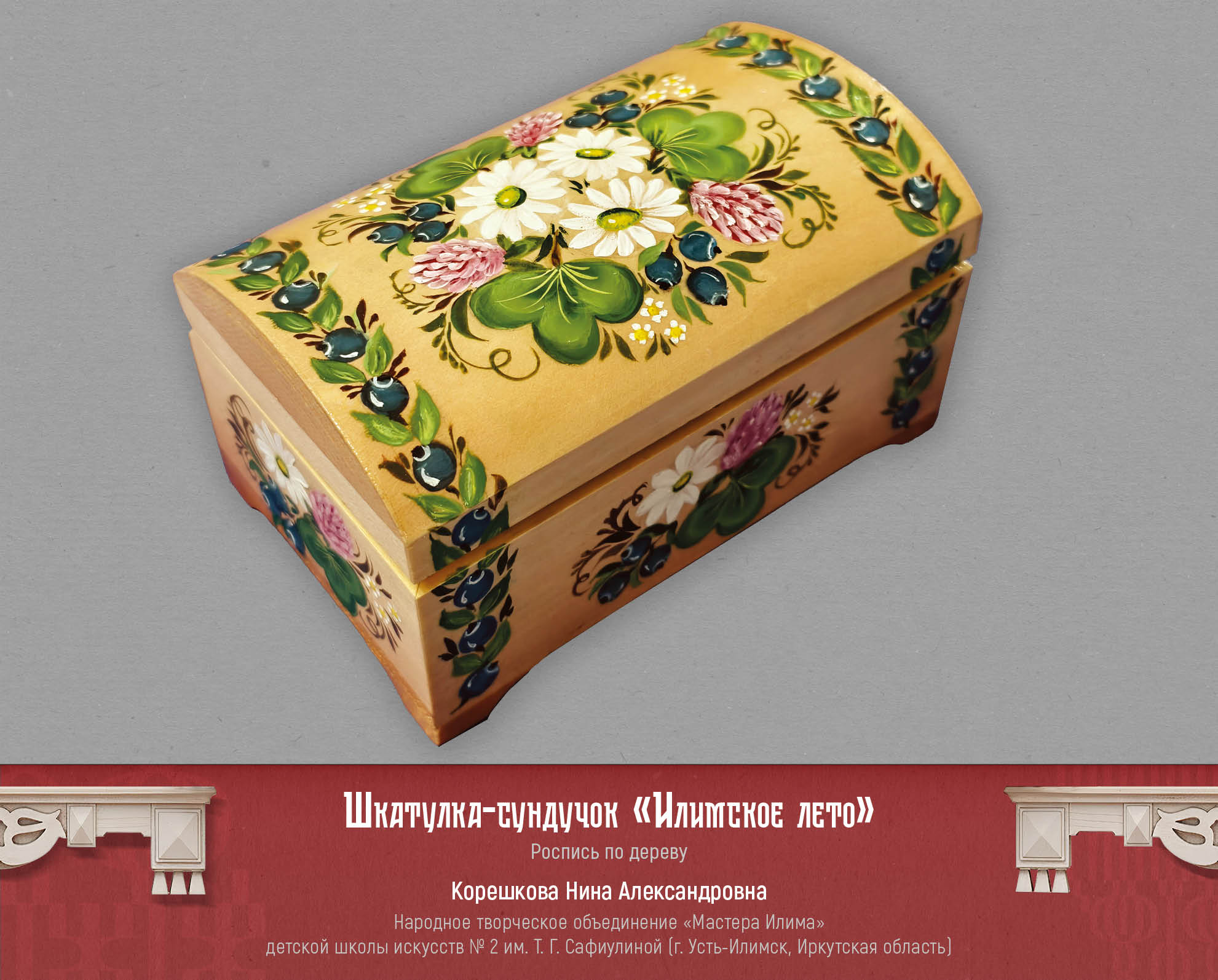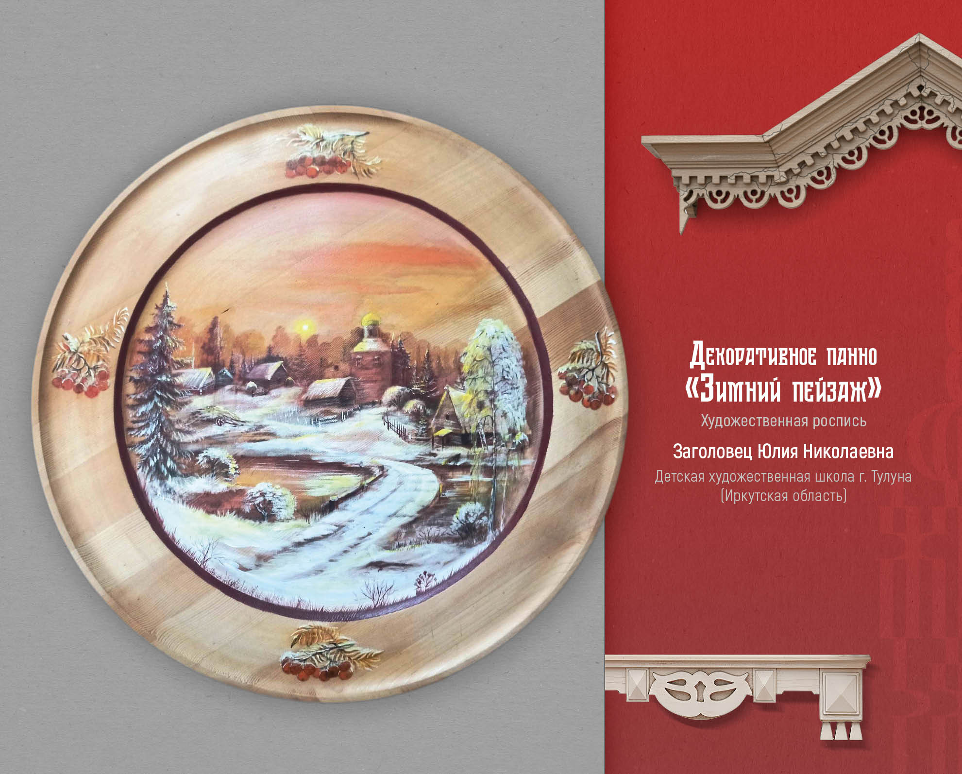 Художник, мастер из города Самара Екатерина Самыкина представила свою авторскую роспись по дереву. Декоративные панно, созданные по легендам и мифам разных народов. Одна из работ называется «Манчиха», и иллюстрирует легенду об атаманше вольных казаков. Автор описывает легенду и свою работу так: «Трудовые люди у Манчихи защиты от господ просили. А сама атаманша сказывала: — Хотелось бы мне видеть Волгу вольной рекой. Царство видеть в Жигулях без бар, царей и кормщиков. Ведь сколько кладут труда люди для господ, а сами в нищенстве живут да долю горькую свою клянут, а какая в людях сила! И отвагой, и справедливостью, и красотой наградила молва свою заступницу. Сказывали, что ходит она в широких казацких шароварах, красном кафтане из парчи и в такой же красной шапке. Даже конь ее, и тот красной масти. Изгиб шеи коня символизирует гору, на которой стояла вольница Манчихи. Поселение перевернуто - оно не сохранилось до наших дней. Грива коня выполнена в виде облаков-высоко над Волгой расположились казаки. Хвост коня - река Волга, вдоль берегов которой тянули бурлаки барки. «От крестьянского ропота и земля дрожит». Эта пословица отражает силу и потенциал недовольства крестьян. Давно это было. Зато в памяти людской волжанка навеки осталась. А та гора, что стоит вблизи села Подгоры, и доселе зовется всеми Манчихой». Еще одна работа Екатерины называется «Кильвей», рассказывает о празднике молодого оленя. Рождение оленя для оленевода – это большой праздник, символ жизни и возрождения. Старики говорили: будет олень, будет и жизнь. По внутреннему краю рамки изображен орнамент: Рога дикого оленя. По кругу панно написаны традиционные пословицы, связанные с оленями. На раме прикреплен брелок ручной работы, сшитый вручную из кожи рыб: тайменя и щуки. Еще один национальный праздник вдохновил автора на создание творческой работы – это традиционный башкирский и татарский праздник Каргатуй, посвященный встрече весны.