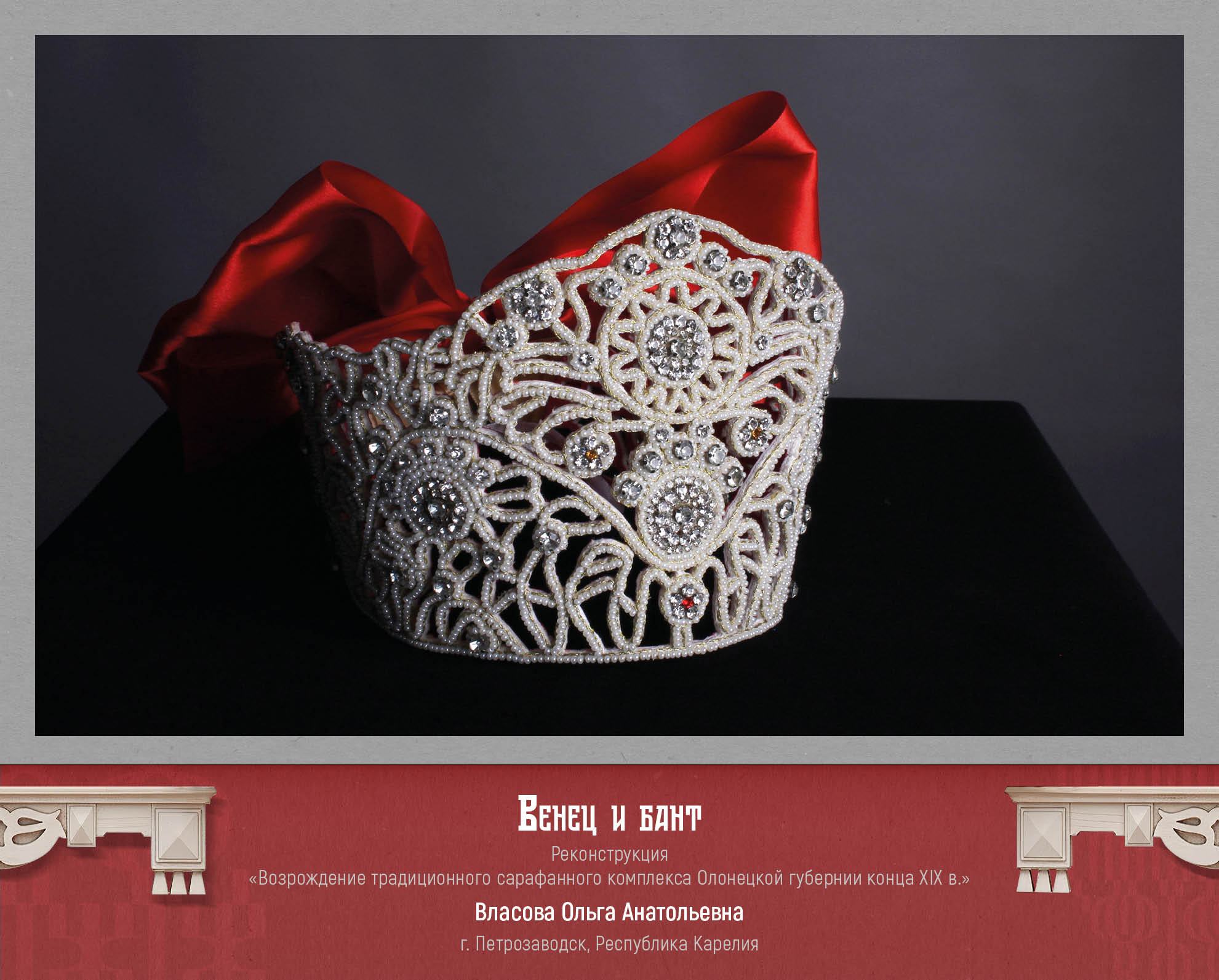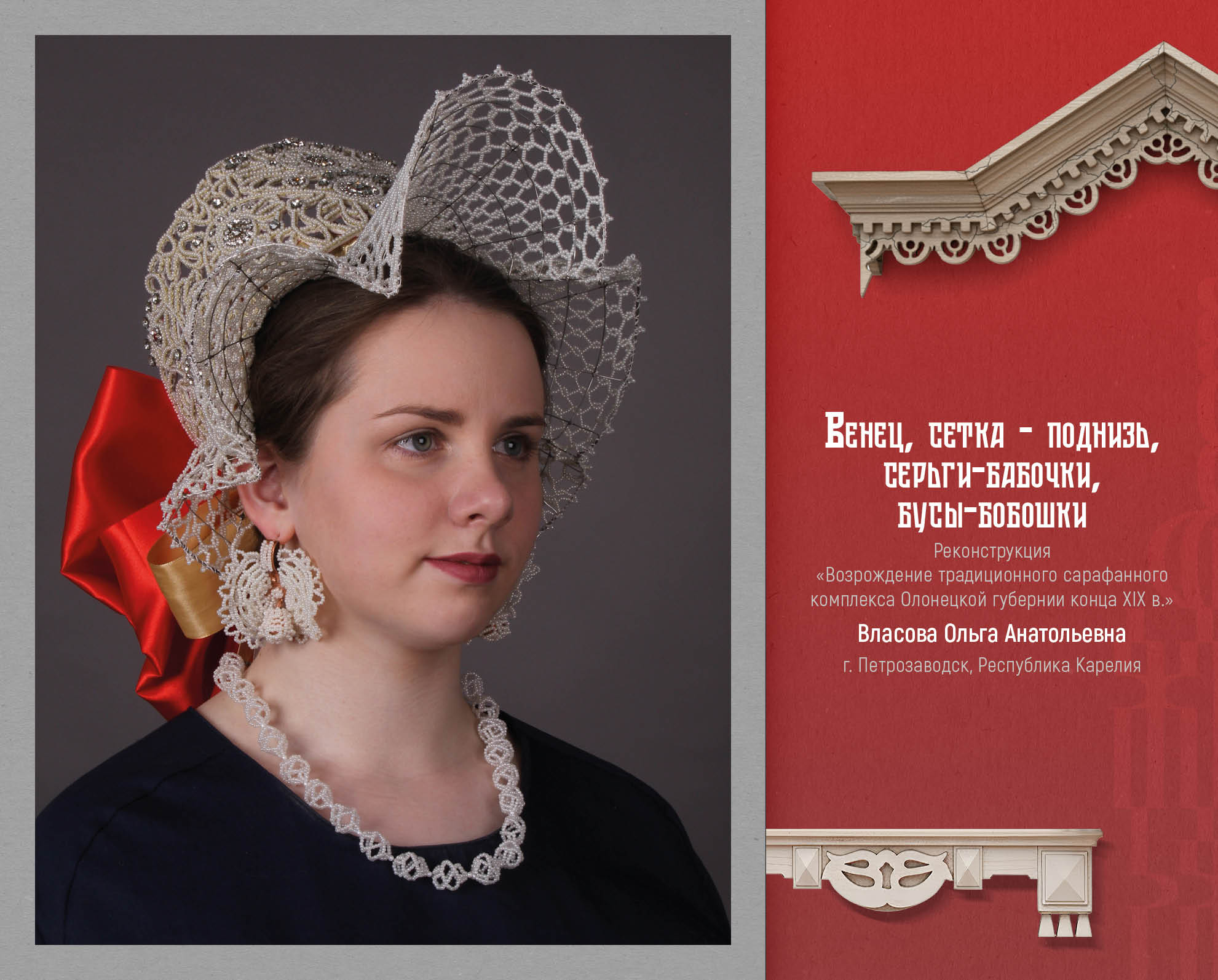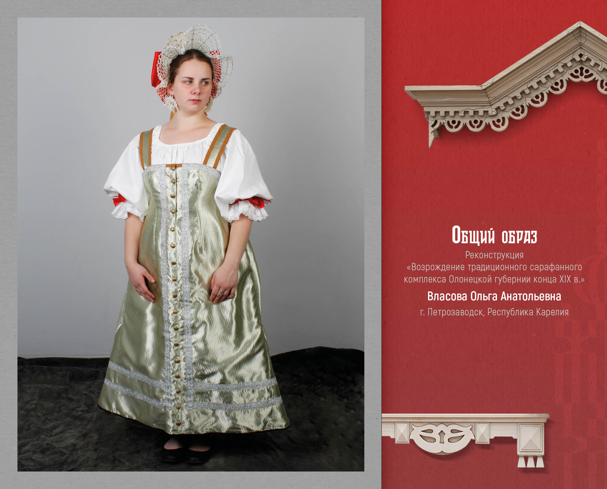 Лауреат 1 степени выставки-конкурса Ольга Власова из Республики Карелия, представила реконструкцию традиционного сарафанного комплекса Олонецкой губернии конца XIX века. Это праздничный девичий сарафанный комплекс, в который входит: рубаха с польскими рукавами, нижние юбки, косоклинный сарафан, головной убор (венец, сетка-поднизь), украшения (серьги-бабочки, бусы-бобошки). В данной реконструкции мы видим глубокое изучение материала, знание технологий и большую любовь к своему роду и истории.