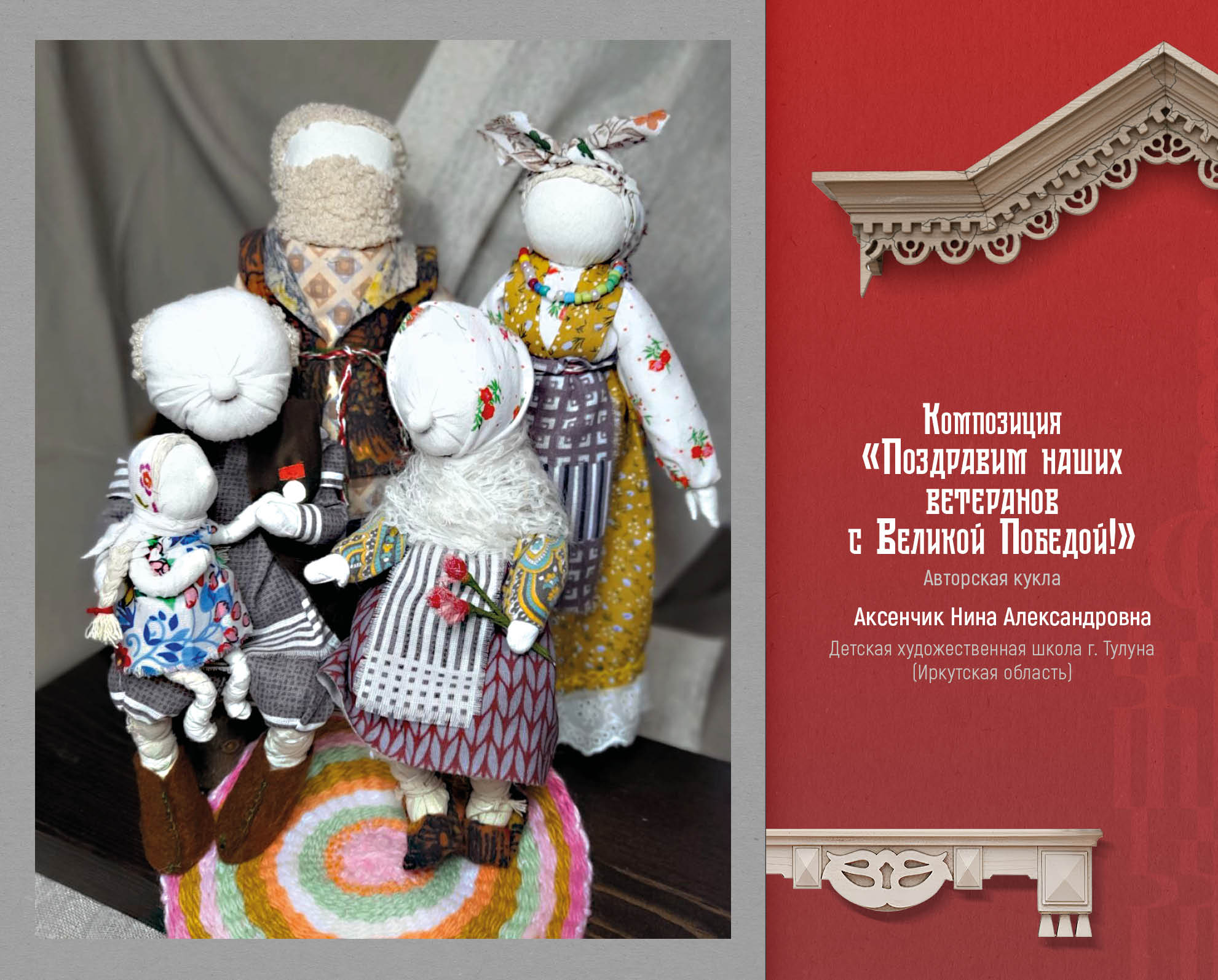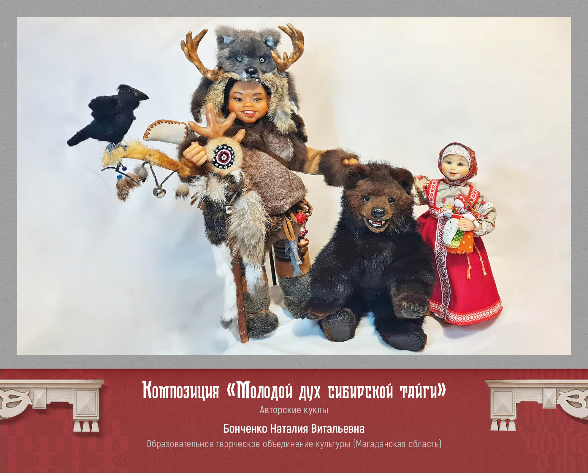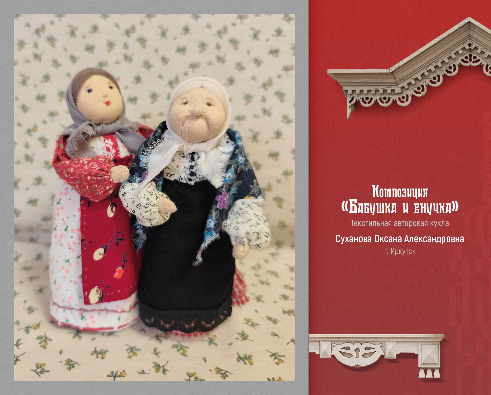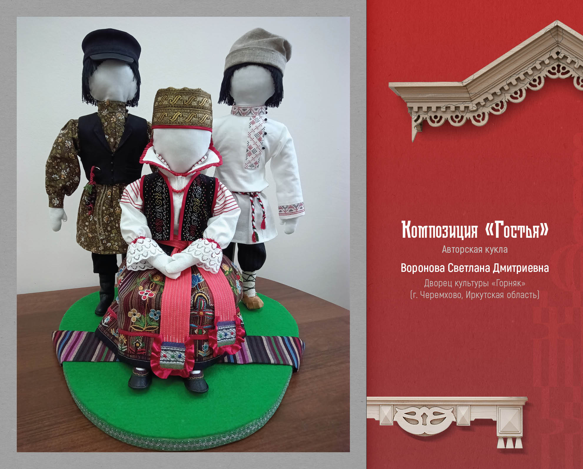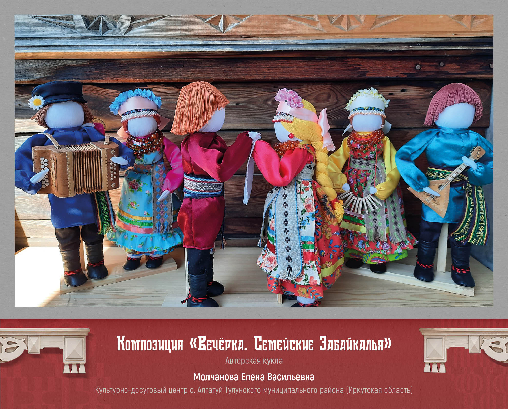 Авторские текстильные куклы представлены мастерицами Светланой Вороновой (г. Черемхово, Иркутская область), Ольгой Аверьяновой (Заларинский округ, Иркутская область), Ниной Аксенчик (г. Тулун, Иркутская область), Оксаной Сухановой (г. Иркутск), Еленой Молчановой (Тулунский район, Иркутская область). Это милые жанровые композиции на тему семьи, малой Родины, традиций.