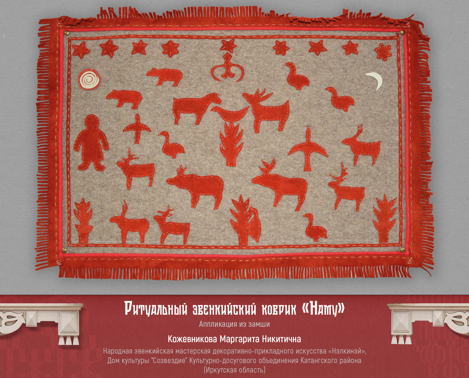 Ритуальный коврик «Наму» создала Маргарита Кожевникова – мастерица эвенкийской мастерской «Нэлкинэй» из северного посёлка Ербогачен, Катангского района Иркутской области. Слово «Наму» в переводе с эвенкийского обозначает «родовая территория». Существует два вида наму: оленные и охотничьи. Оба этих вида использовались при большом весеннем обряде сэвэкан, при мелких обрядах благодарения хэвэки за удачную охоту, при просьбах послать охотничью удачу и благополучия рода, здоровое стадо, детей и т.д. Эти коврики представляют собой нечто наподобие иконы у христиан. Наму окуривают дымом, делают помазывание кровью, приносят небольшие жертвы, бросая в огонь кусочки жира. Хранят наму в тайне от посторонних глаз в ритуальной шкатулке муручун со святынями семьи или рода. Наму изготовлялись по заказу шамана, и не для всех семей, а только для тех, у которых появлялась в этом потребность: не водились олени, долгое время была неудачной охота, появлялись болезни. Изготовление наму приурочивалось к обряду сэвэкан. Во время этого обряда в наму вводили священную силу мусун. Раньше наму были родовым достоянием, но с разложением первобытно – общинного строя родовые святыни перешли к семье.