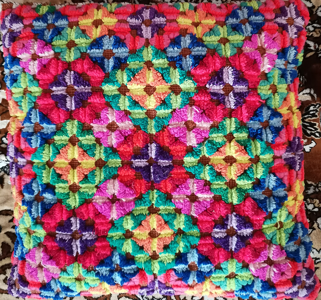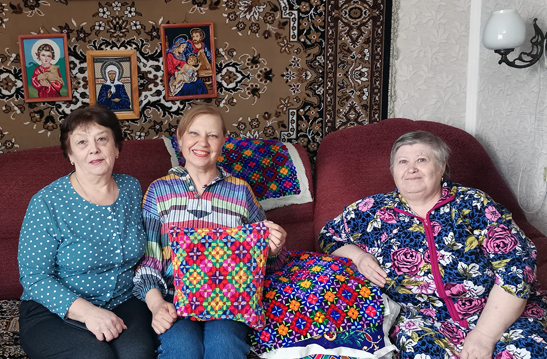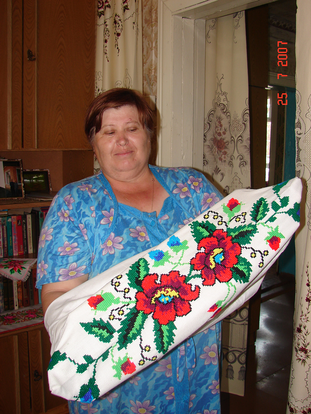 Интересно, что первый информант Лидии Мельниковой Любовь Фасолько вспомнила: будучи в гостях на своей родине, в Хмельницкой области Украины, она тоже видела, как женщины вышивают в подобной технике. Но сибирский способ отличается от неё уже композицией и колоритом. Любовь Викторовна вышила более 25 подушек, почти все раздарила родным и друзьям.