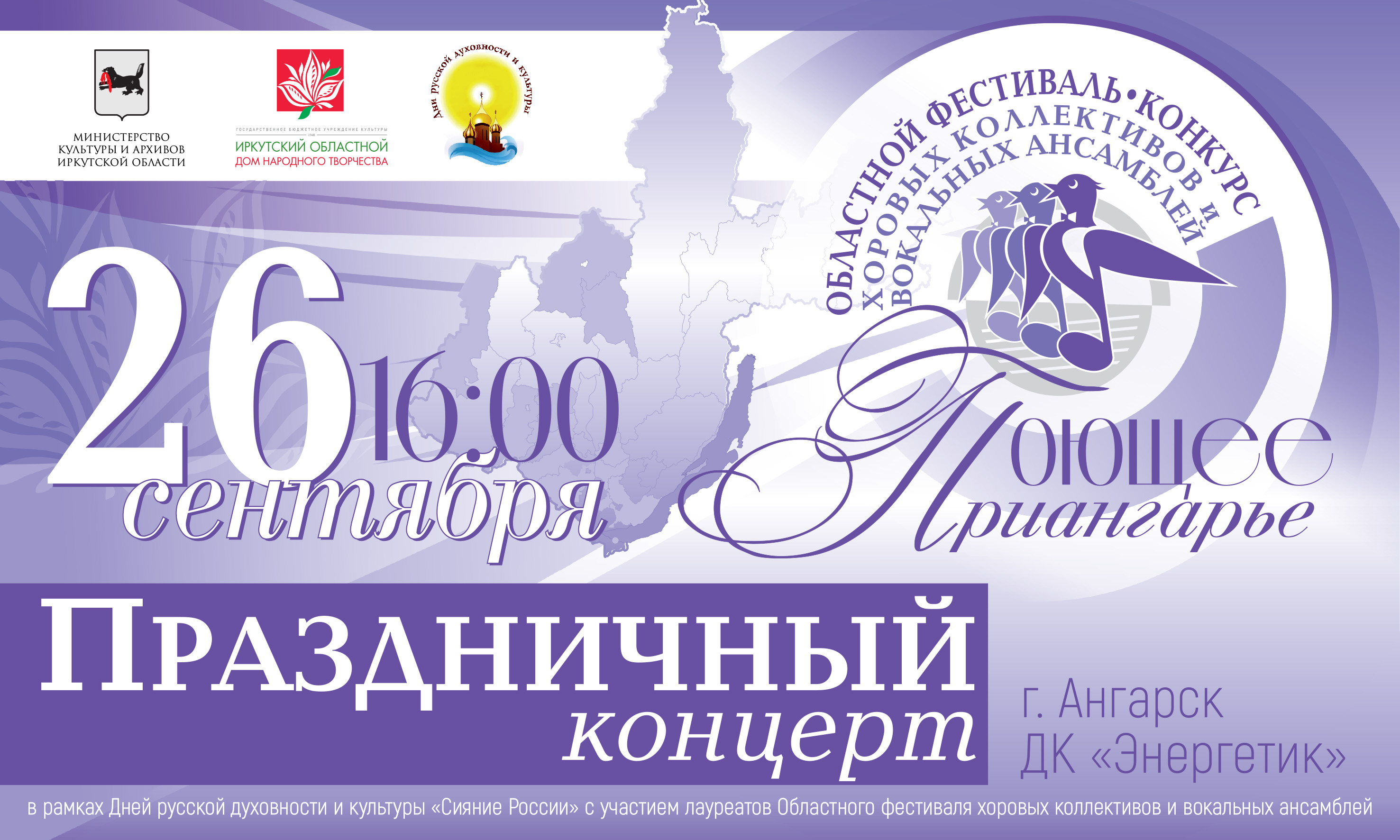 26 сентября в 16.00 на сцене ангарского Дворца культуры «Энергетик» состоится праздничный концерт в рамках Дней русской духовности и культуры «Сияние России» с участием лауреатов I степени отборочного этапа фестиваля-конкурса «Поющее Приангарье».