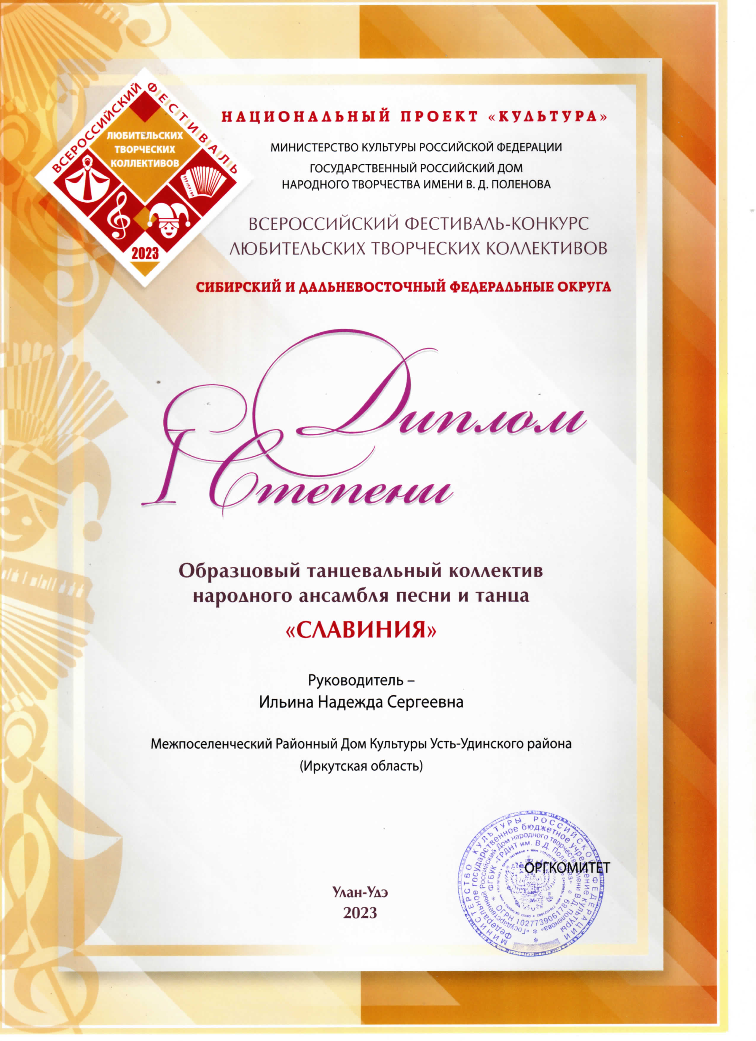 Танцевальный коллектив «Славиния» вышел в финал фестиваля-конкурса и стал обладателем диплома I степени. Вот уже 32 года самодеятельные танцоры под руководством Надежды Ильиной изучают и представляют публике традиционную сибирскую народную культуру, особенности русского народного костюма. Поколения сменяют друг друга, воспитывая у участников ансамбля чувства патриотизма. Этот молодёжный танцевальный коллектив входит в состав народного ансамбля песни и танца «Славиния».