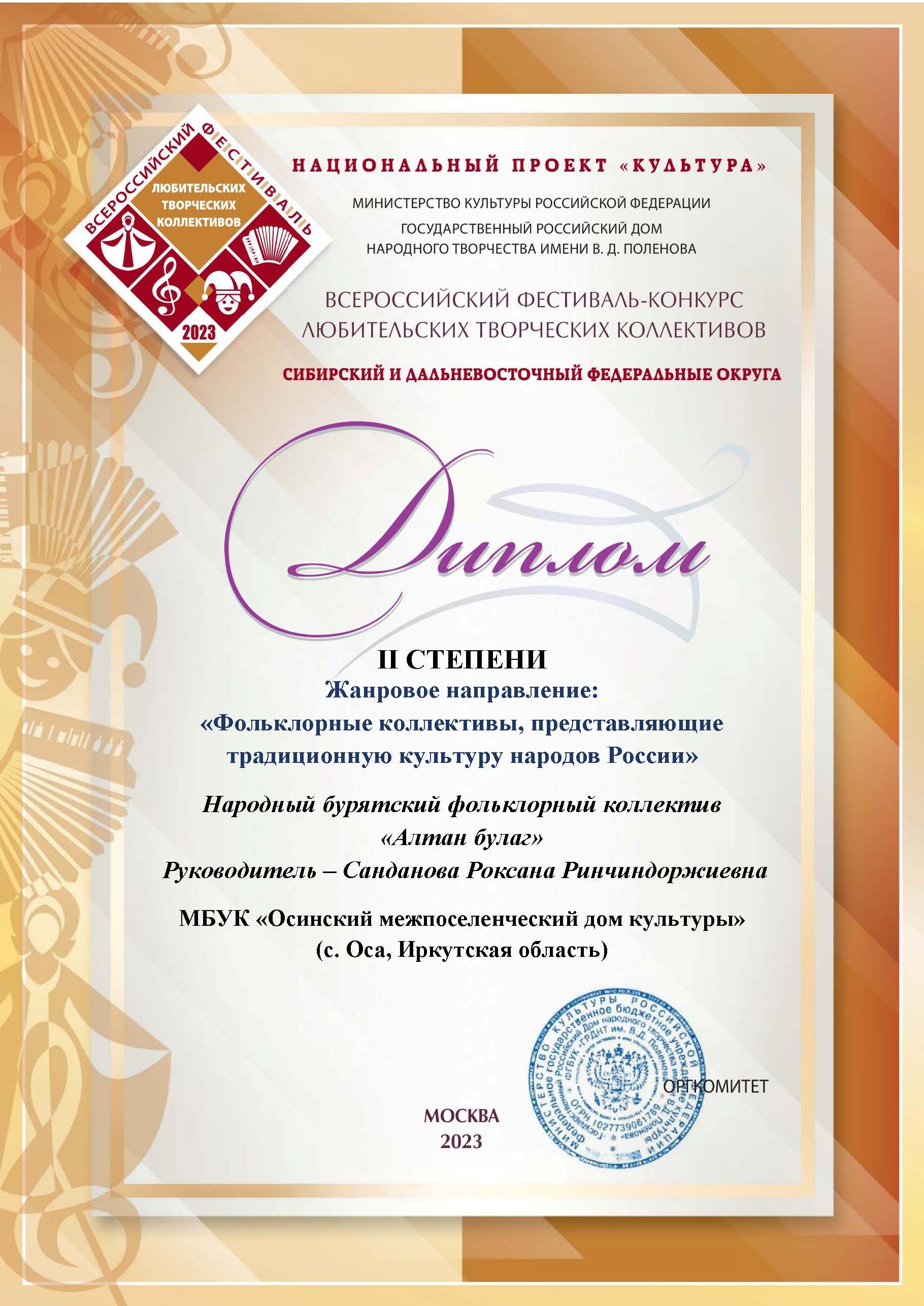 Среди фольклорных коллективов, представляющих традиционную культуру народов России жюри отметило дипломом II степени народный бурятский фольклорный коллектив «Алтан булаг». Его создала в 2011 году Цырен-Ханда Батожапова. С 2020 года коллективом руководит Роксана Санданова. В составе 16 человек, это люди разных профессий: преподаватели, банковские сотрудники, работники администрации Осинского муниципального района и, конечно, работники культуры. Репертуар включает обряды, игры и бурятские, собранные во время этнографических экспедиций по Осинскому району.