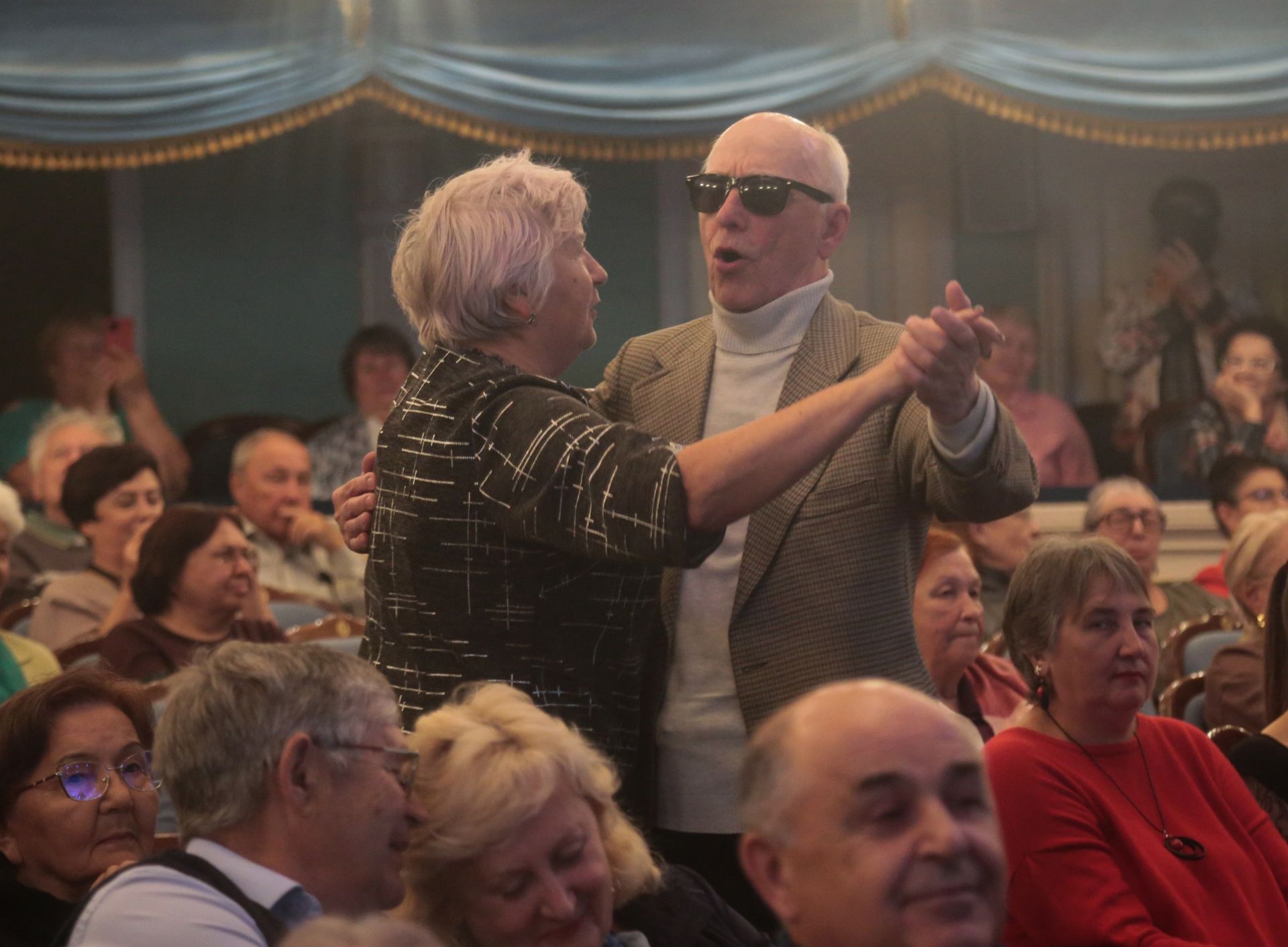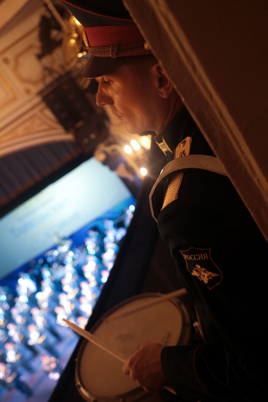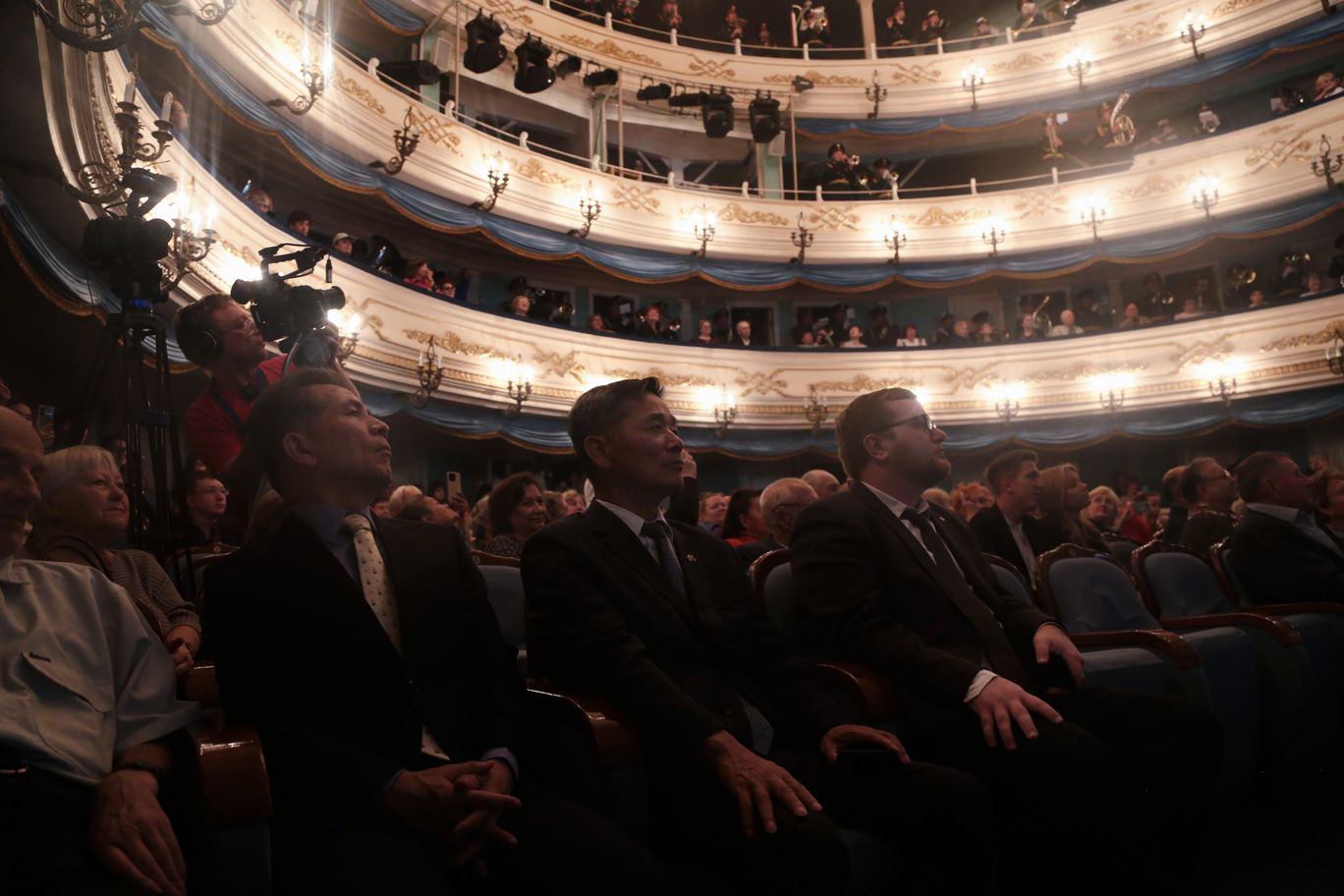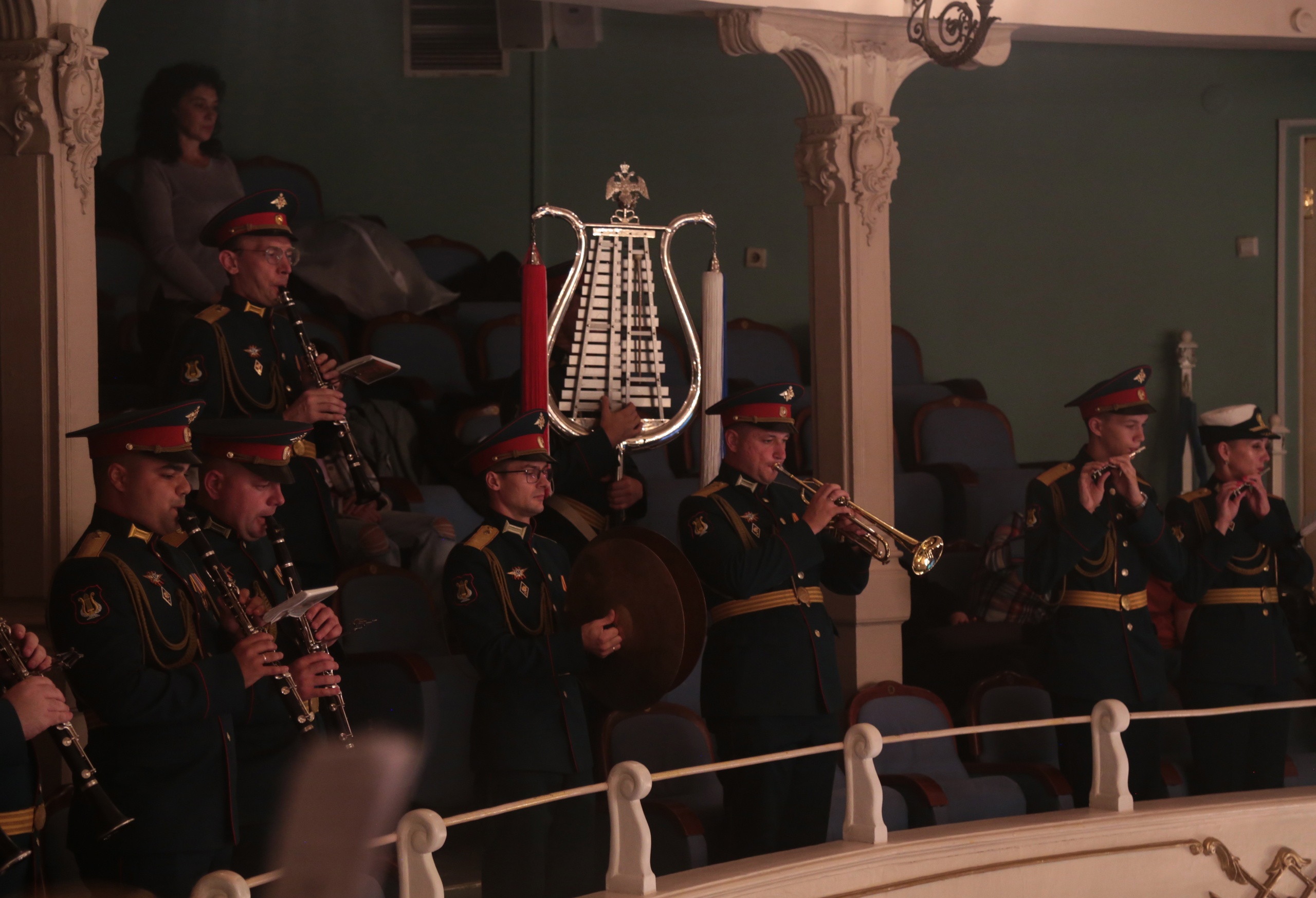 Военный оркестр встречал гостей у входа в Иркутский академический драматический театр. А на сцене состоялось настоящее шоу исполнителей на духовых инструментах.