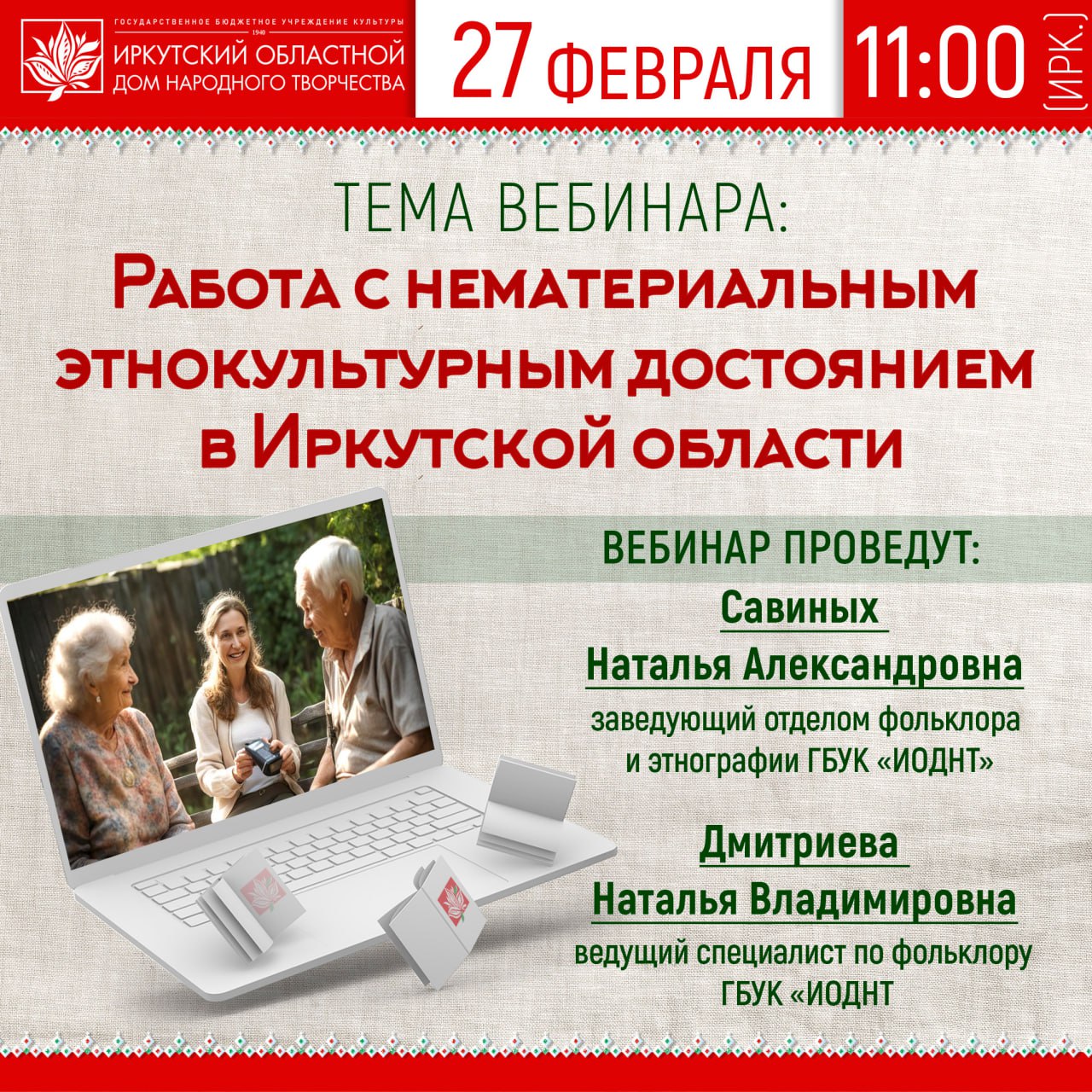 Вебинары проводит отдел фольклора и этнографии Иркутского областного Дома народного творчества. Ближайшая онлайн-встреча состоится 27 февраля в 11:00. Для участия необходимо пройти регистрацию: https://my.mts-link.ru/3194325/2001567670