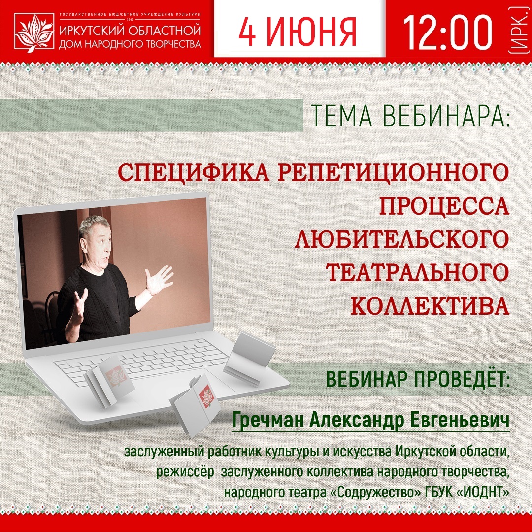 Александр Евгеньевич Гречман – создатель и режиссёр заслуженного коллектива народного творчества, народного театра «Содружество» Иркутского областного Дома народного творчества. Его вебинар поможет организовать плодотворный и целесообразный репетиционный процесс, нацеленный на рост актёрских умений и творческого самовыражения.