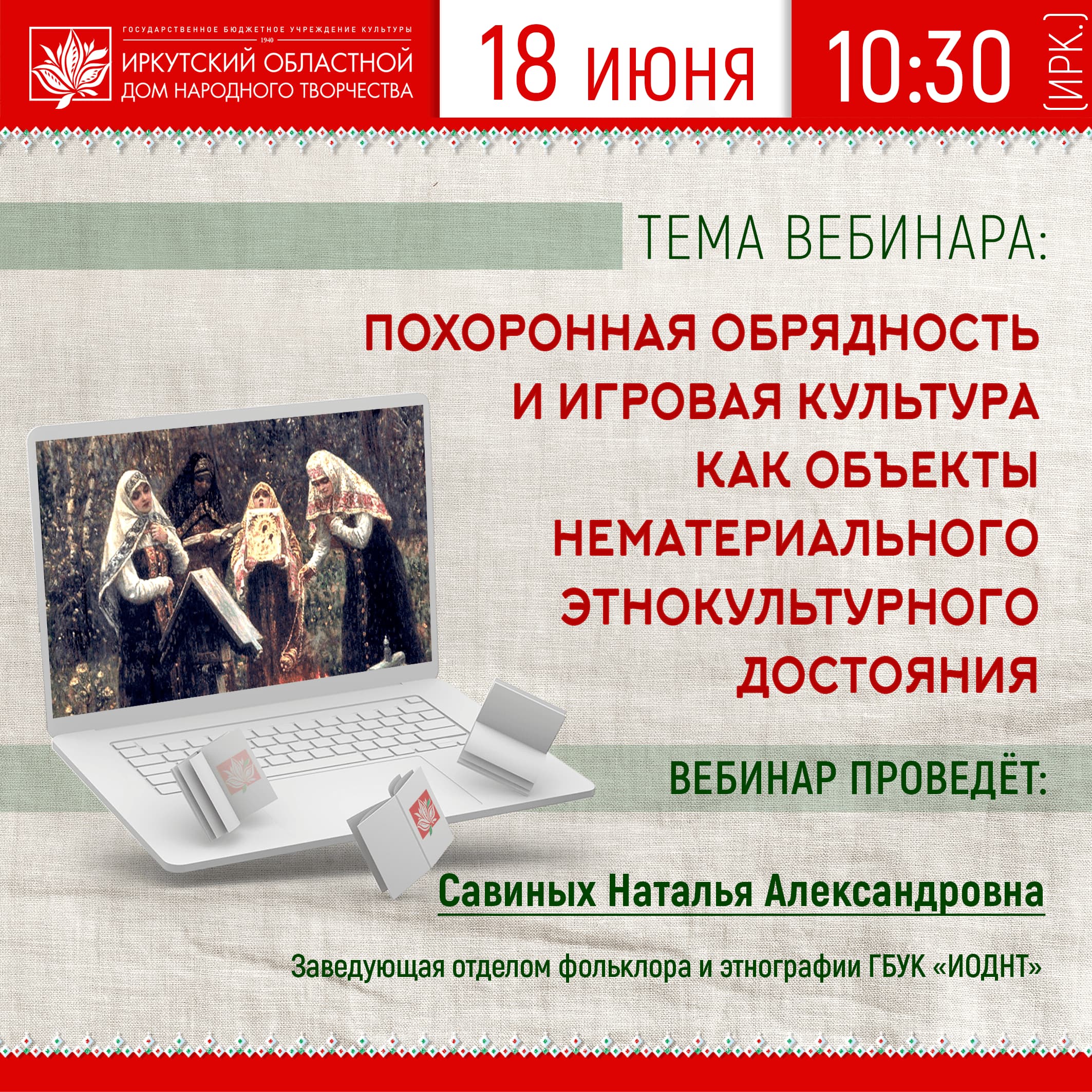 Отдел фольклора и этнографии Иркутского областного Дома народного творчества приглашает на вебинар из цикла, посвященного работе с нематериальным этнокультурным достоянием в Иркутской области. Встреча состоится 18 июня в 10:30. Регистрация доступна по ссылке.