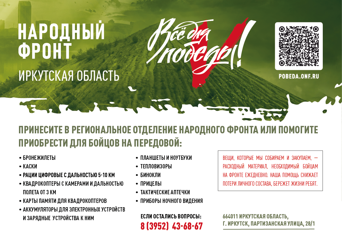 Желающие оказать помощь могут также обратиться в исполком Народного фронта по адресу: г. Иркутск, ул. Партизанская 28/1, тел.: +7 (3952) 43-68-67.
