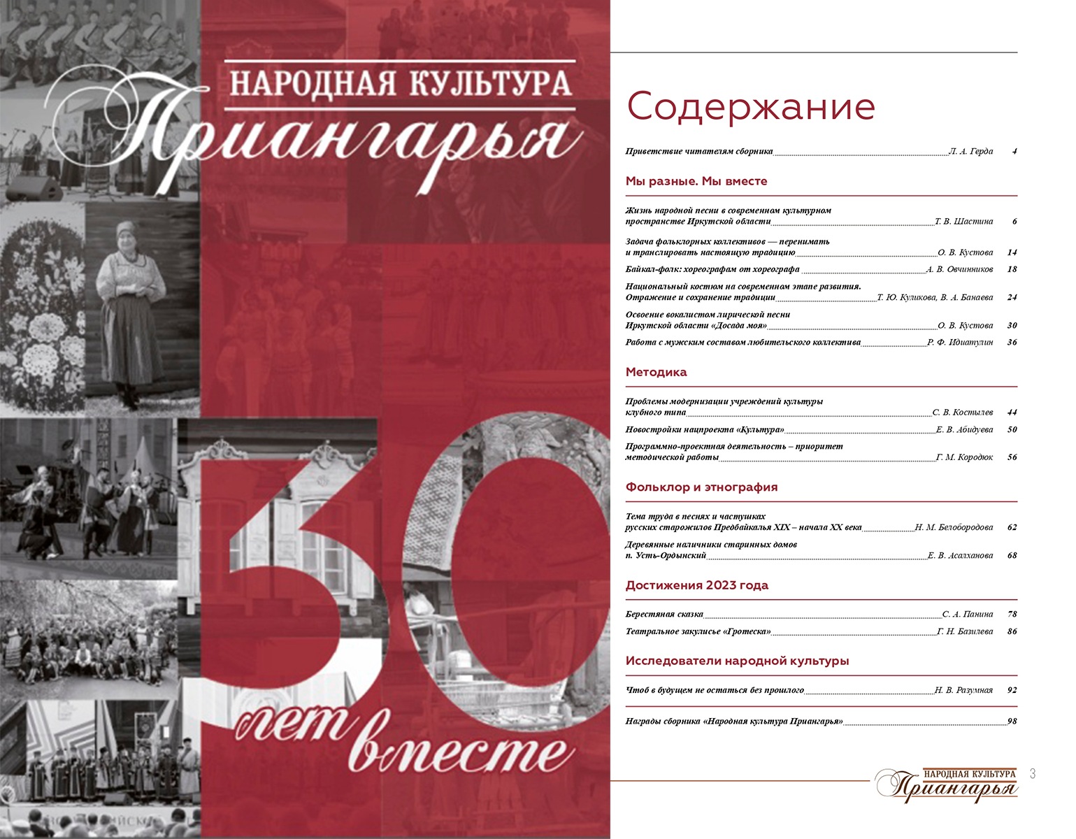 Издательский проект Иркутского областного Дома народного творчества представил юбилейный выпуск сборника «Народная культура Приангарья». Это единственное в области профессиональное периодическое печатное издание для специалистов культурно-досуговых учреждений.