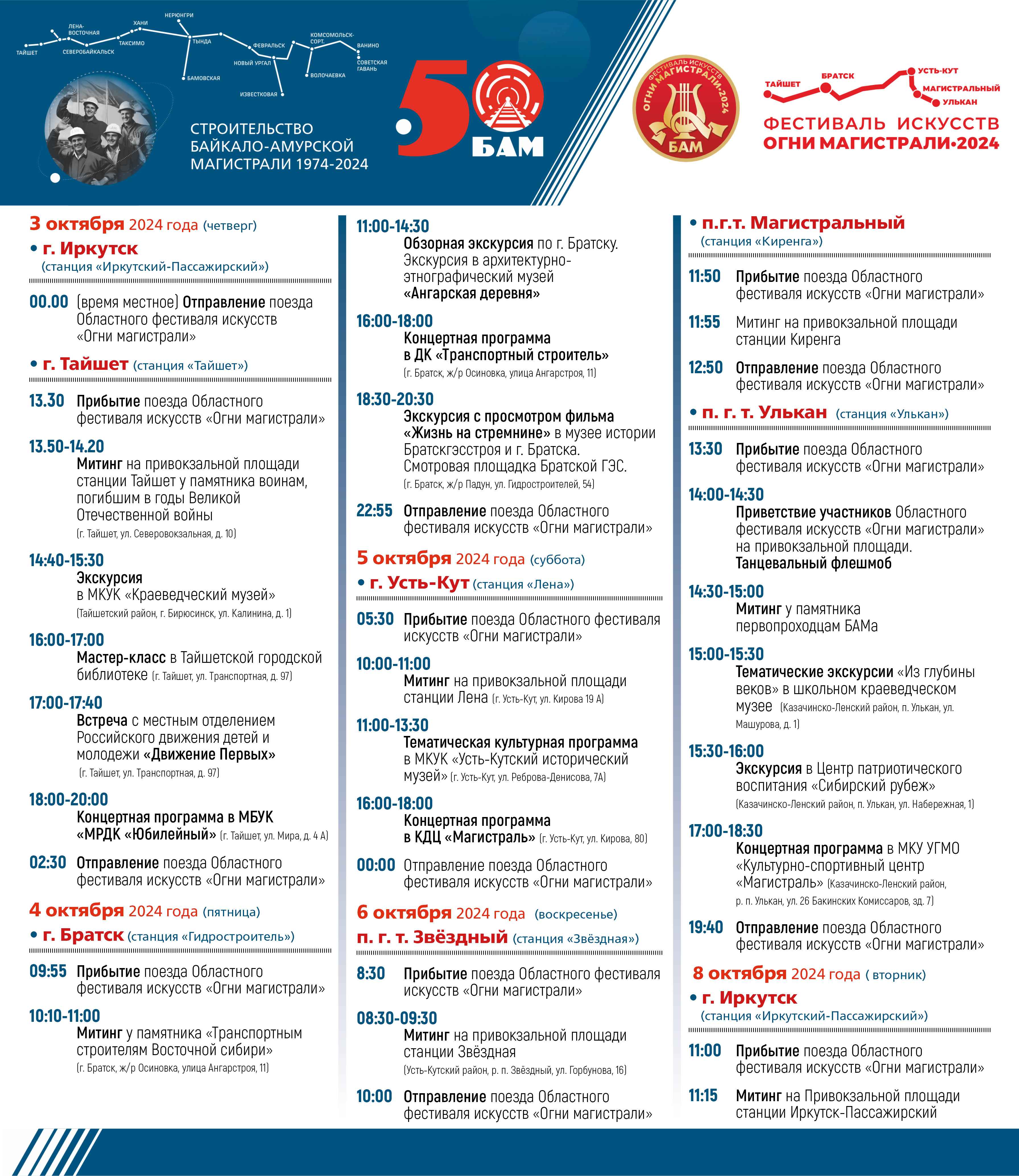 Поезд с участниками фестиваля совершит остановки в ключевых пунктах строительства БАМа. Концерты, творческие встречи, экскурсии и мастер-классы пройдут в Тайшете, Братске, Усть-Куте, а также в поселках Звёздный, Магистральный и Улькан. В 2024 году фестиваль «Огни магистрали» приурочен к пятидесятилетию начала строительства Байкало-Амурской магистрали – одной из крупнейших железнодорожных строек мира. Ровно полвека назад, в 1974 году, иркутский областной отряд в составе 200 человек отправился в путь до Усть-Кута, чтобы дать старт этому масштабному и сложному процессу.