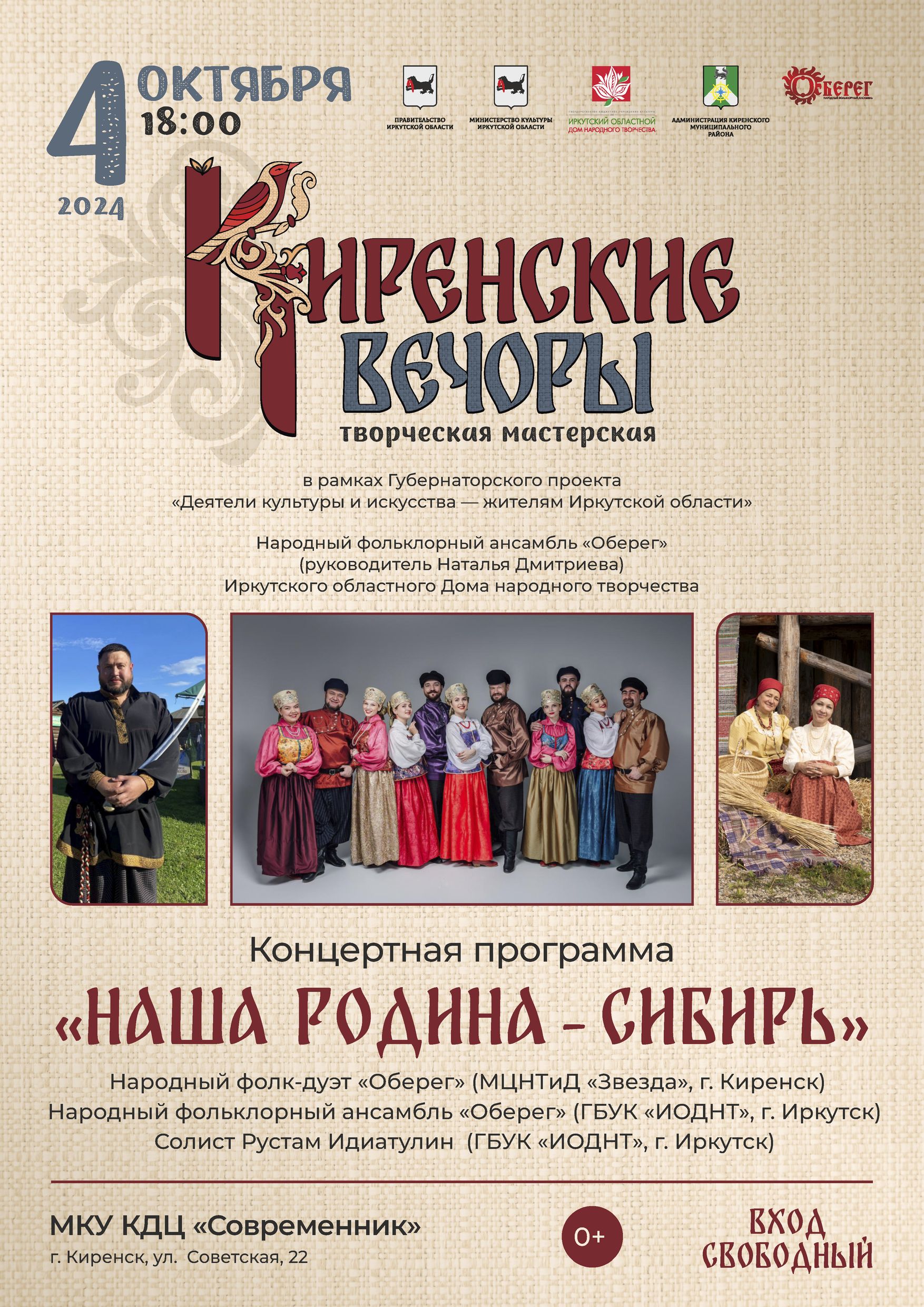 Концерт «Наша родина – Сибирь» объединит творческие силы киренских любительских коллективов и исполнителей из Иркутска. Выступят народный фолк-дуэт «Обере́г», народный фольклорный ансамбль «О́берег» под руководством Натальи Дмитриевой и солист Рустам Идиатулин. Сценическое действие создано на основе культурного наследия Сибири, её традиций и самобытности. Подобранный репертуар также популяризирует современных сибирских авторов.
