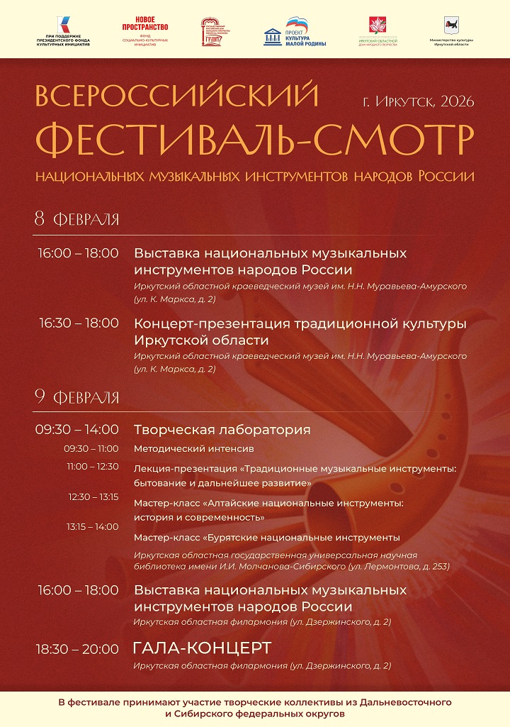 Программу для посетителей 8 и 9 февраля составят мероприятия на нескольких площадках: концерт-презентация народной культуры Иркутской области, выставка национальных музыкальных инструментов, творческая лаборатория и гала-концерт. В Иркутск прибудут лучшие исполнители – лауреаты регионального этапа фестиваля Сибирского и Дальневосточного федеральных округов.
