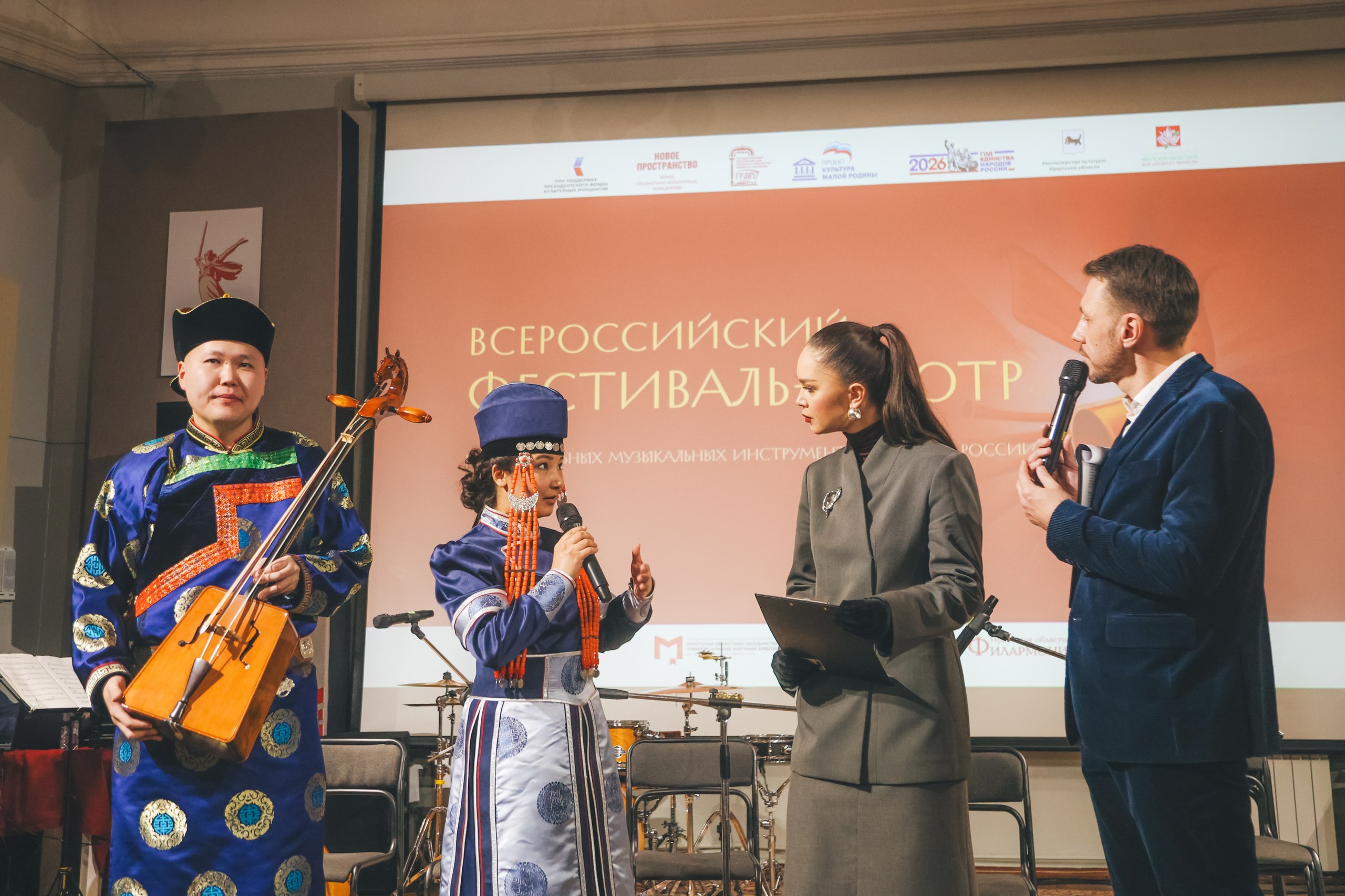 Столица Приангарья дала старт большому музыкальному марафону, объединяющему исполнителей, исследователей и мастеров – тех, кто работает с национальными музыкальными инструментами народной России. В 2026 году фестиваль-смотр состоится в четырёх регионах страны: Иркутская область, Республика Карелия, Удмуртская Республика, Ставропольский край – охватывая все федеральные округа страны. В Иркутск прибыли яркие исполнители из Сибирского и Дальневосточного федеральных округов – около 80 талантливых музыкантов.