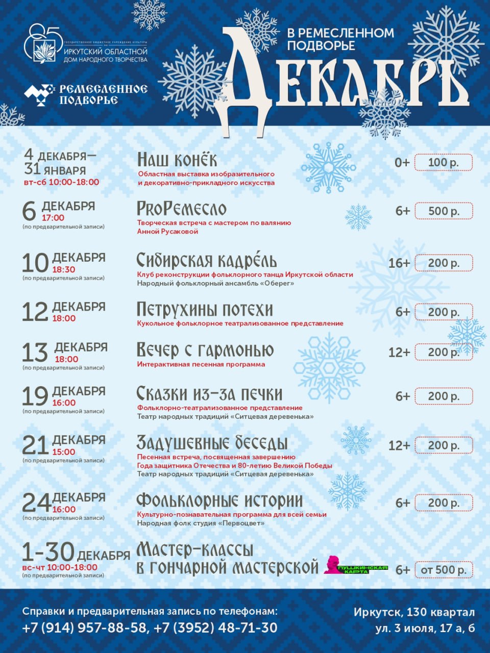 Кабы не было зимы, а всё время лето... – не узнали б никогда, что декабрь в Ремесленном подворье учудил! А чудеса и правда будут: после долгих странствий возвращаются наши добрые друзья Петруха и театр народных традиций «Ситцевая деревенька». И, конечно, нас ждут полюбившиеся многим вечёрки с танцами и живой музыкой, творческие встречи и душевные посиделки за чашечкой чая. Устраивайтесь поудобнее, рассказываем обо всём по порядку!