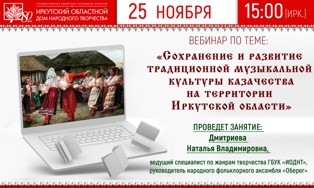 25 ноября в 15.00 состоится очередной вебинар по теме «Сохранение и развитие традиционной музыкальной культуры казачества на территории Иркутской области». Проведет занятие Дмитриева Наталья Владимировна, ведущий специалист по жанрам творчества ГБУК ИОДНТ, руководитель народного фольклорного ансамбля «Оберег».