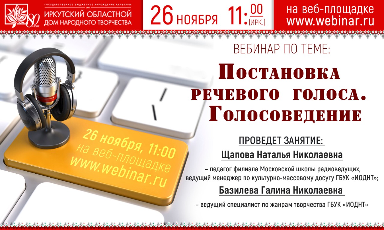 Иркутский областной Дом народного творчества начинает цикл вебинаров по сценической речи. 26.11.2020 в 11:00на веб-площадке www.webinar.ru пройдет вебинар по теме: «Постановка речевого голоса. Голосоведение»