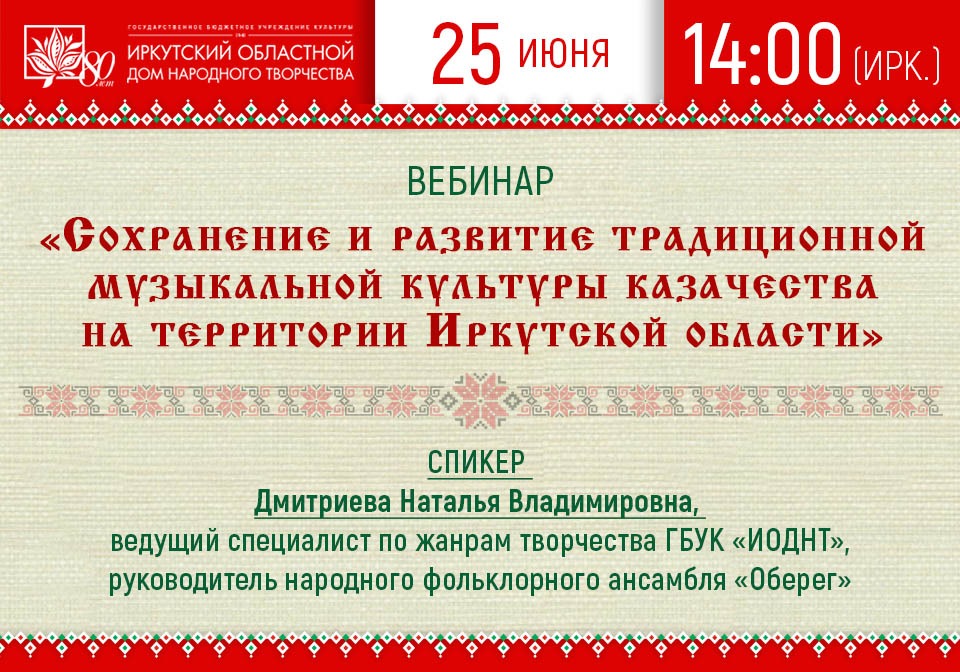 25 июня в 14.00 состоится очередной вебинар по теме «Сохранение и развитие традиционной музыкальной культуры казачества на территории Иркутской области». Проведет занятие Дмитриева Наталья Владимировна, ведущий специалист по жанрам творчества ГБУК «ИОДНТ», руководитель народного фольклорного ансамбля «Оберег».