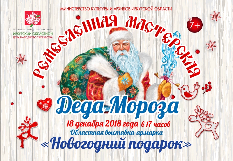 18 декабря в 17.00 часов в отделе «Ремесленное подворье» Иркутского областного Дома народного творчества состоится торжественное открытие ремесленной мастерской Деда Мороза. Главный зимний волшебник, наконец, откроет тайну появления новогодних подарков и поделиться секретами народного ремесла.