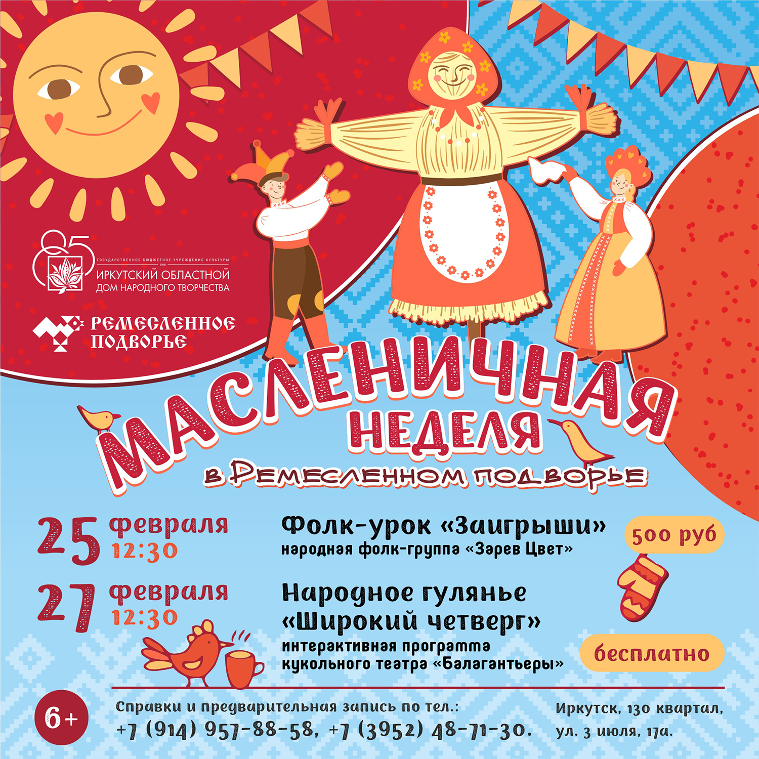 В эту субботу Ремесленное подворье приглашает на фольклорную интерактивную программу «Покровские вечёрки». Познакомимся с историей праздника Покрова, станцуем кадрили, бытовавшие еще в Иркутской губернии, и поиграем в шумные вечёрочные игры. Начало в 18:00.