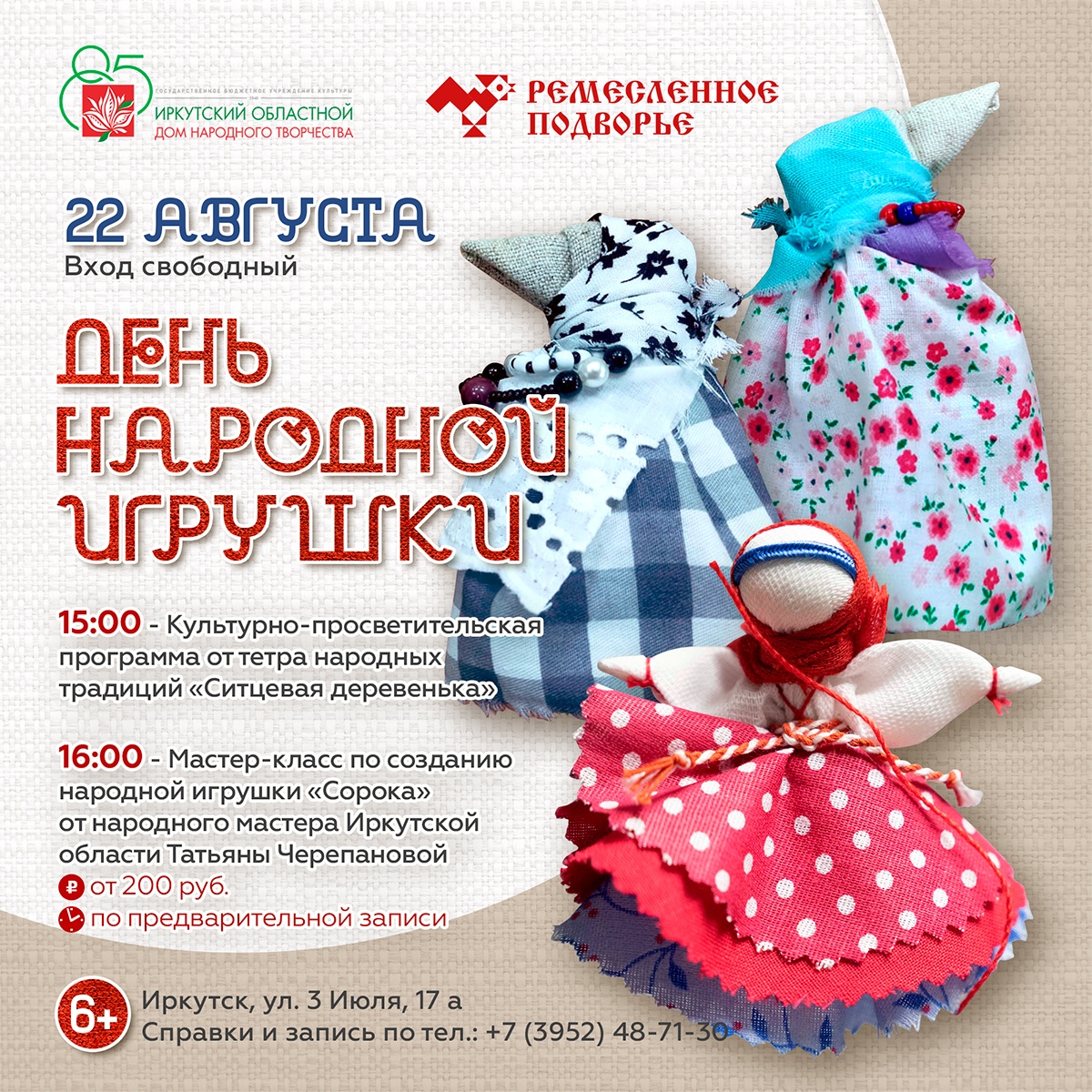 Подробнее: 22 августа Ремесленное подворье приглашает на День народной игрушки