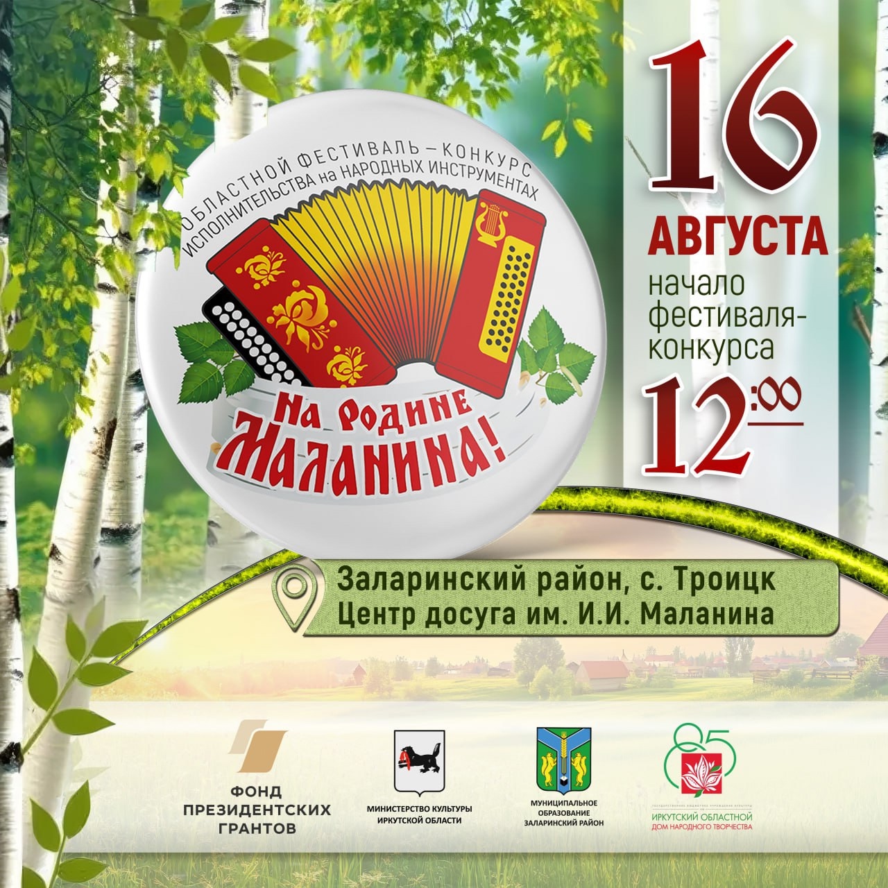 16 августа в селе Троицк Заларинского района состоится гала-концерт областного фестиваля-конкурса исполнительства на народных инструментах «На родине Маланина». Это событие в пятый раз объединит любителей народной музыки Иркутской области, других российских регионов и зарубежья.