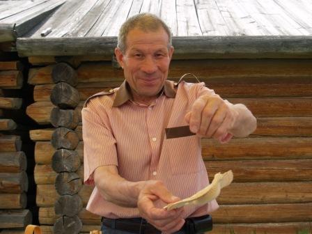 Особой гордостью мастера являются щепные «Птицы счастья». При изготовлении птиц используется традиционная щепная птица русского Севера. Бережно сохраняя народные традиции, а именно, применяя традиционные материалы, сохраняя народную идею изделия, мастер творчески развивает эти традиции. Применение авторских конструктивных приемов в изготовлении сделало птиц более легкими, воздушными, изящными.