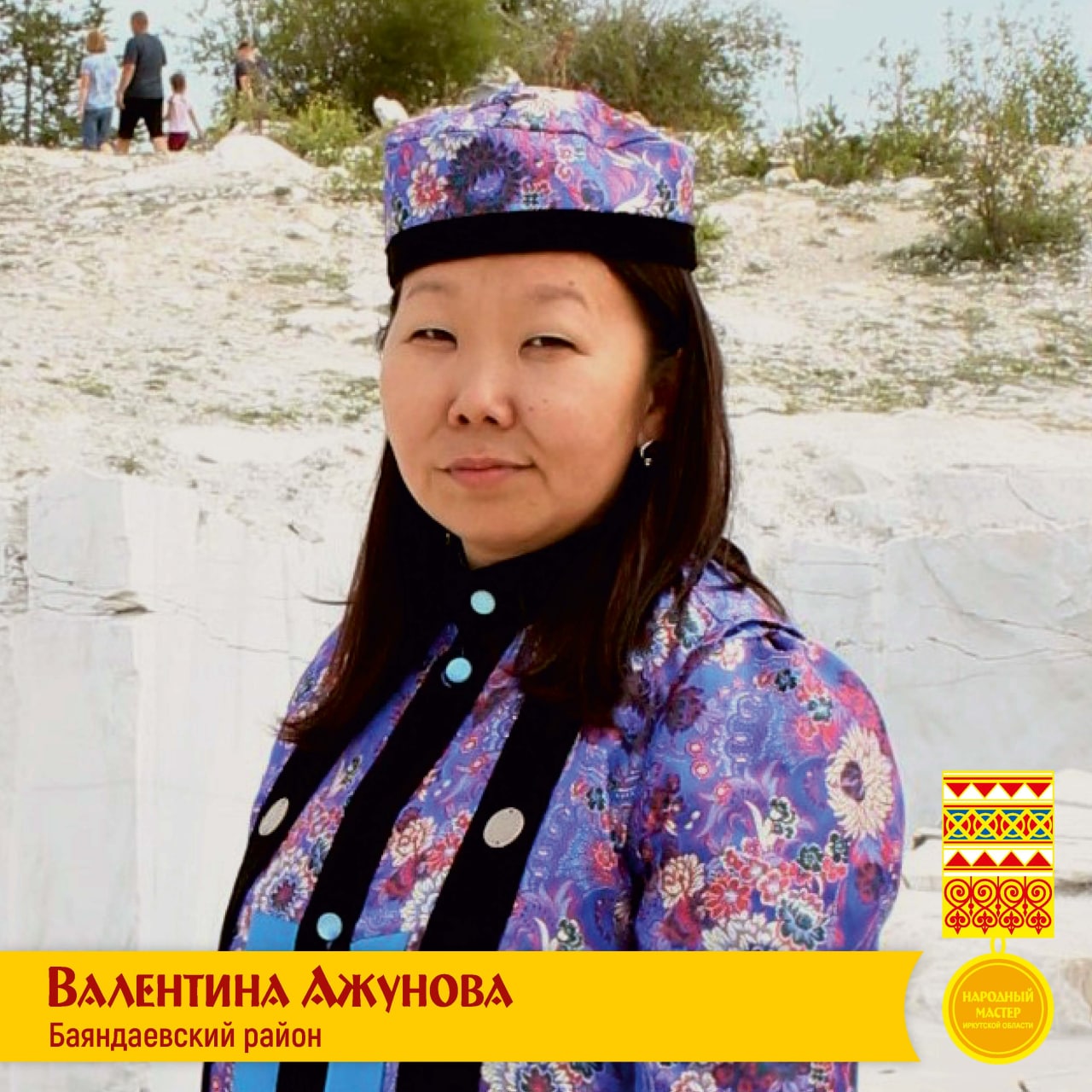 Валентина Ажунова родилась 3 октября 1980 года в с. Баяндай Баяндаевского района Иркутской области. В 2010 году окончила Иркутский государственный технический университет, получив специальность художника-декоратора, керамиста. С 2011 года работает в областном государственном бюджетном учреждении культуры «Усть-Ордынский Национальный центр художественных народных промыслов». Ведет активную работу по возрождению, сохранению и популяризации традиционных бурятских ремесел. Занимается созданием эскизов художественного оформления культурно-спортивных мероприятий Усть-Ордынского Бурятского округа. За активное участие в подготовке и проведении областного культурно-спортивного праздника «Сур-Харбан-2011» отмечена благодарностью администрации Усть-Ордынского Бурятского округа.