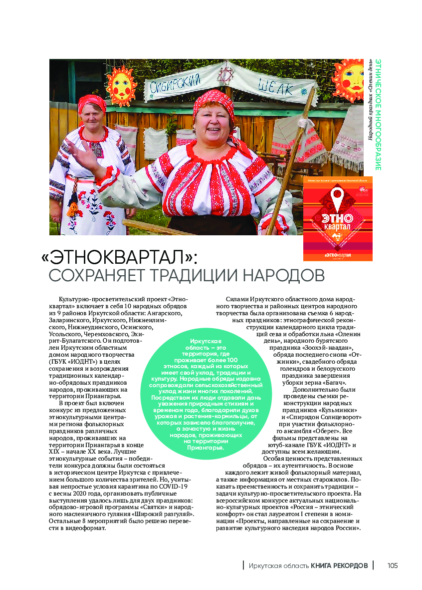 Проект «ЭТНОквартал» показывает самобытность и ценность народных традиций. Его цель – сохранение и возрождение уникальных образцов культуры этносов, проживающих на территории Приангарья. В создании сборника приняли участие творческие коллективы, мастера декоративно-прикладного искусства, представители национальных сообществ региона. Всего в «ЭТНОквартал» включили 10 народных обрядов из 9 районов Иркутской области.