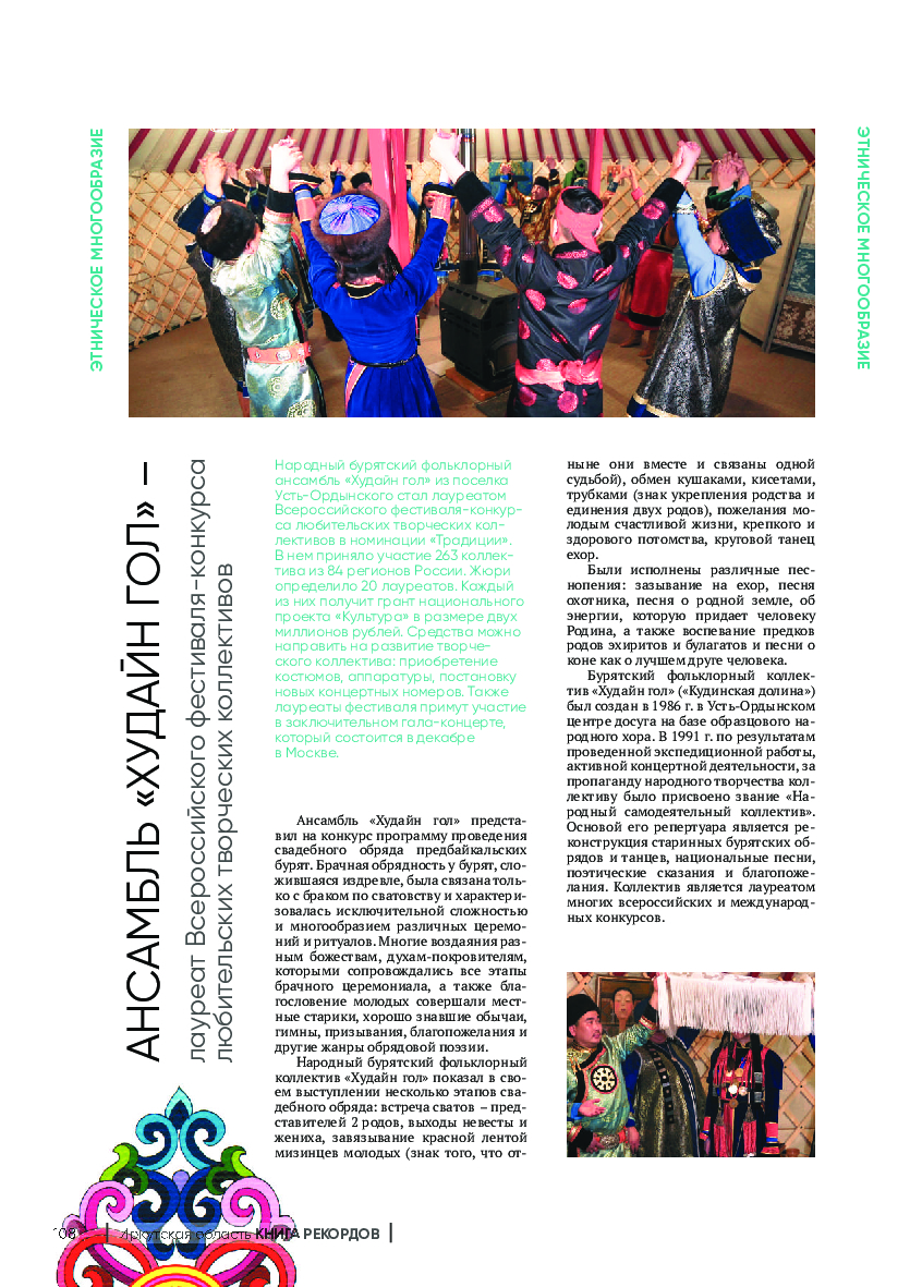 Также в Книге рекордов Иркутской области в этот раз отметили народный фольклорный ансамбль «Худайн гол» из посёлка Усть-Ордынский, который стал лауреатом Всероссийского фестиваля-конкурса любительских творческих коллективов в номинации «Традиции». «Худайн гол» представил на конкурс программу проведения свадебного обряда предбайкальских бурят. Ансамбль «Худайн гол» – яркий самобытный коллектив. Его участники изучают, сохраняют и популяризируют национальную бурятскую культуру.