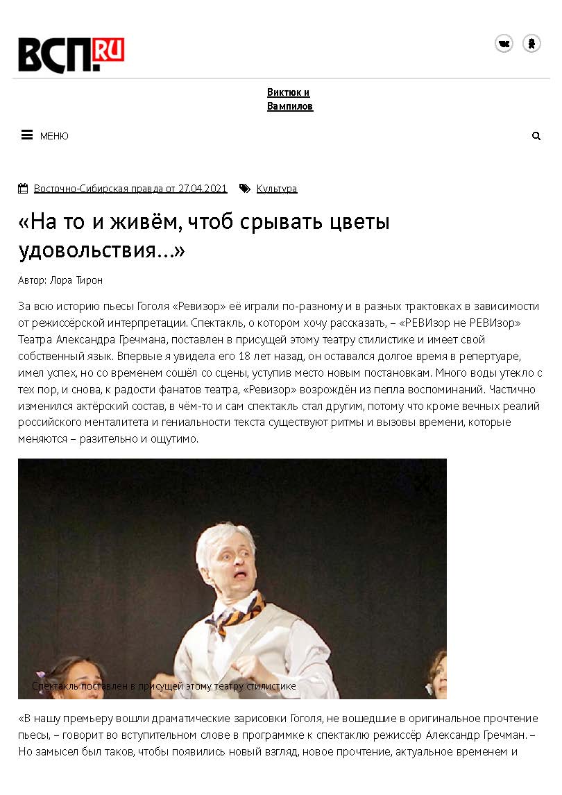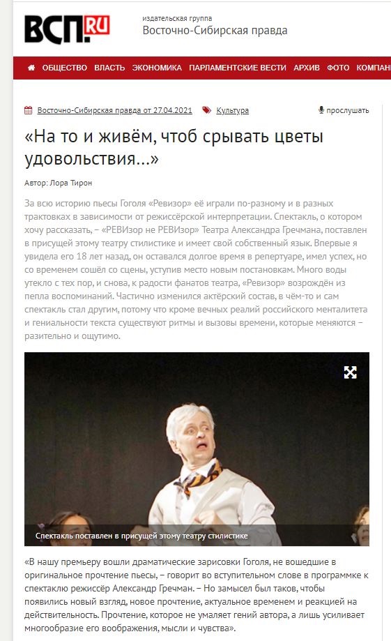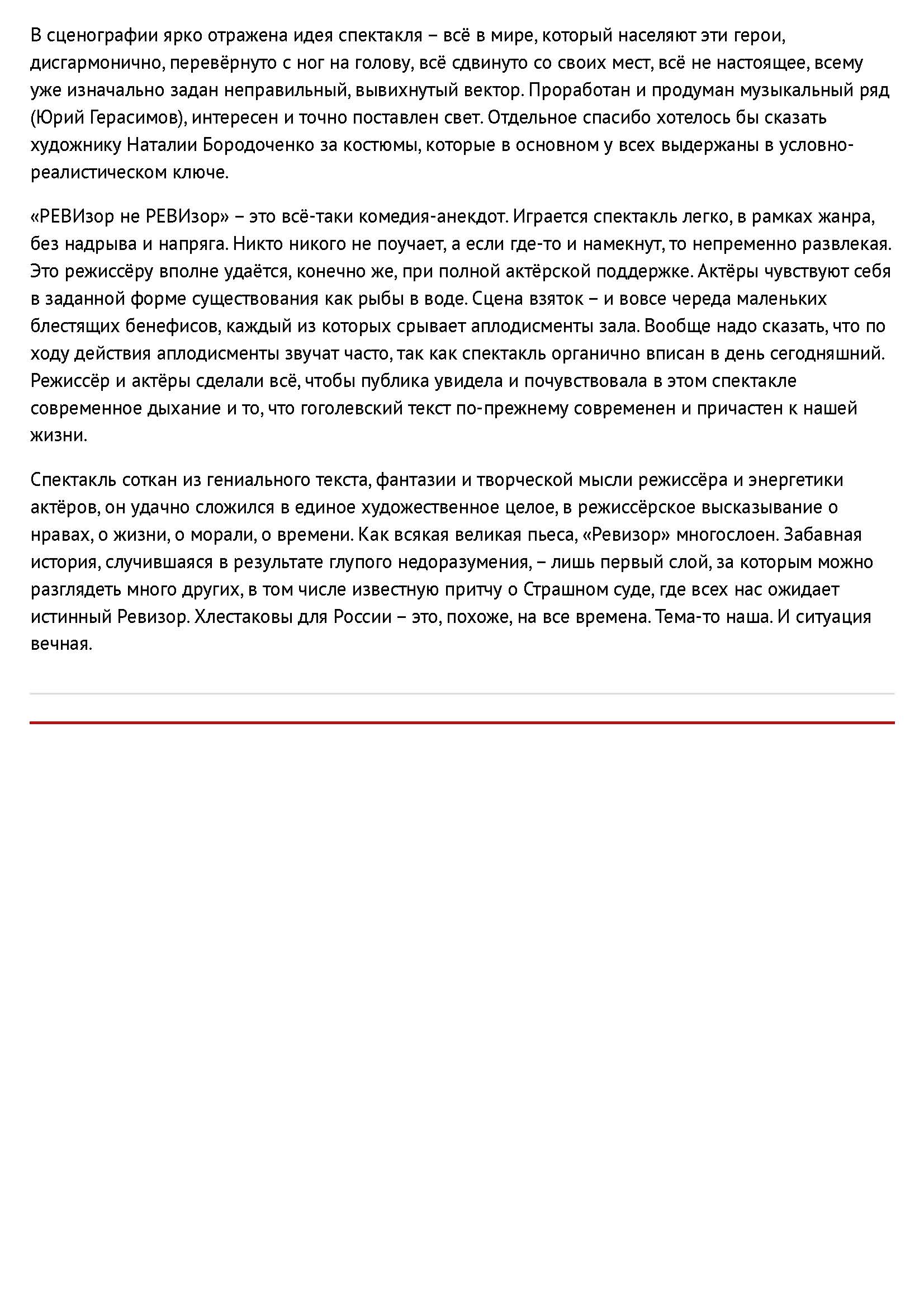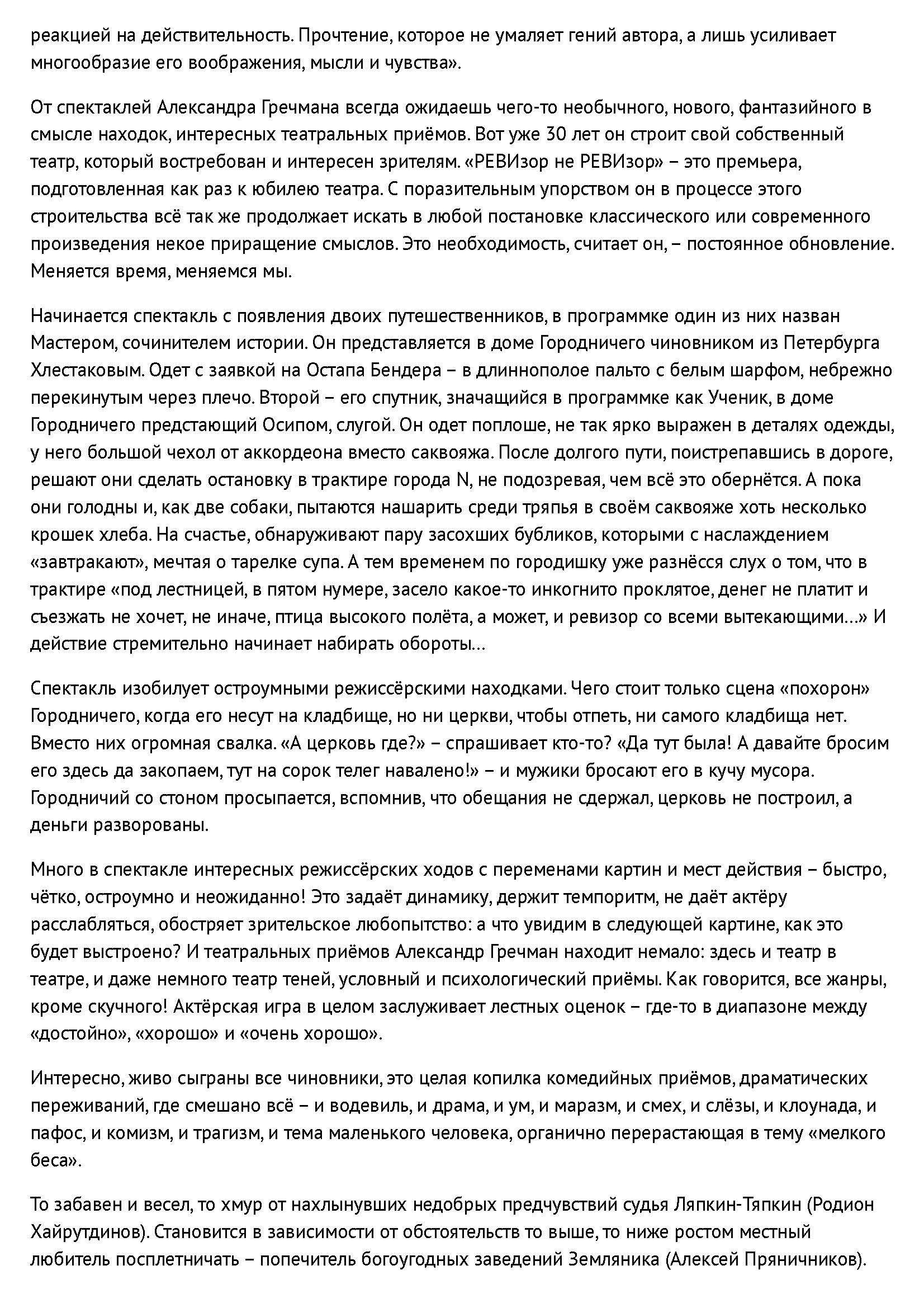 Статья Лоры Тирон о спектакле «РЕВИзор не РЕВИзор» театра Александра Гречмана