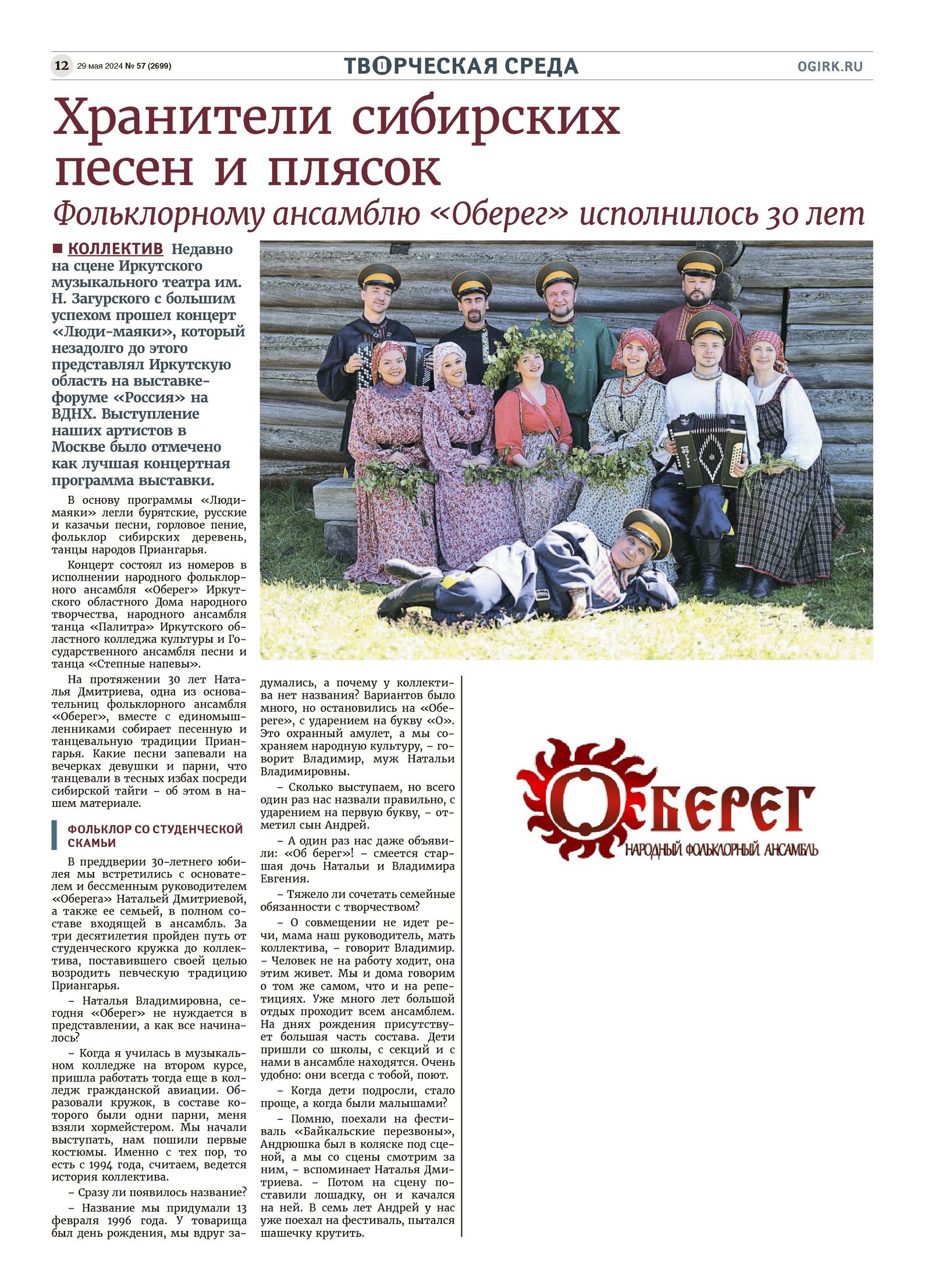 Статья «Хранители сибирских песен и плясок» рассказывает о юбилярах 2024 года: 30-летнем народном фольклорном ансамбле «Оберег» Иркутского областного Дома народного творчества. Основатель и руководитель семейного коллектива Наталья Дмитриева рассказала об увлекательном пути от студенческого кружка до ансамбля, поставившего себе цель возродить певческую традицию Приангарья. Ссылка на материал: https://www.ogirk.ru/2024/05/29/hraniteli-sibirskih-pesen-i-pljasok/