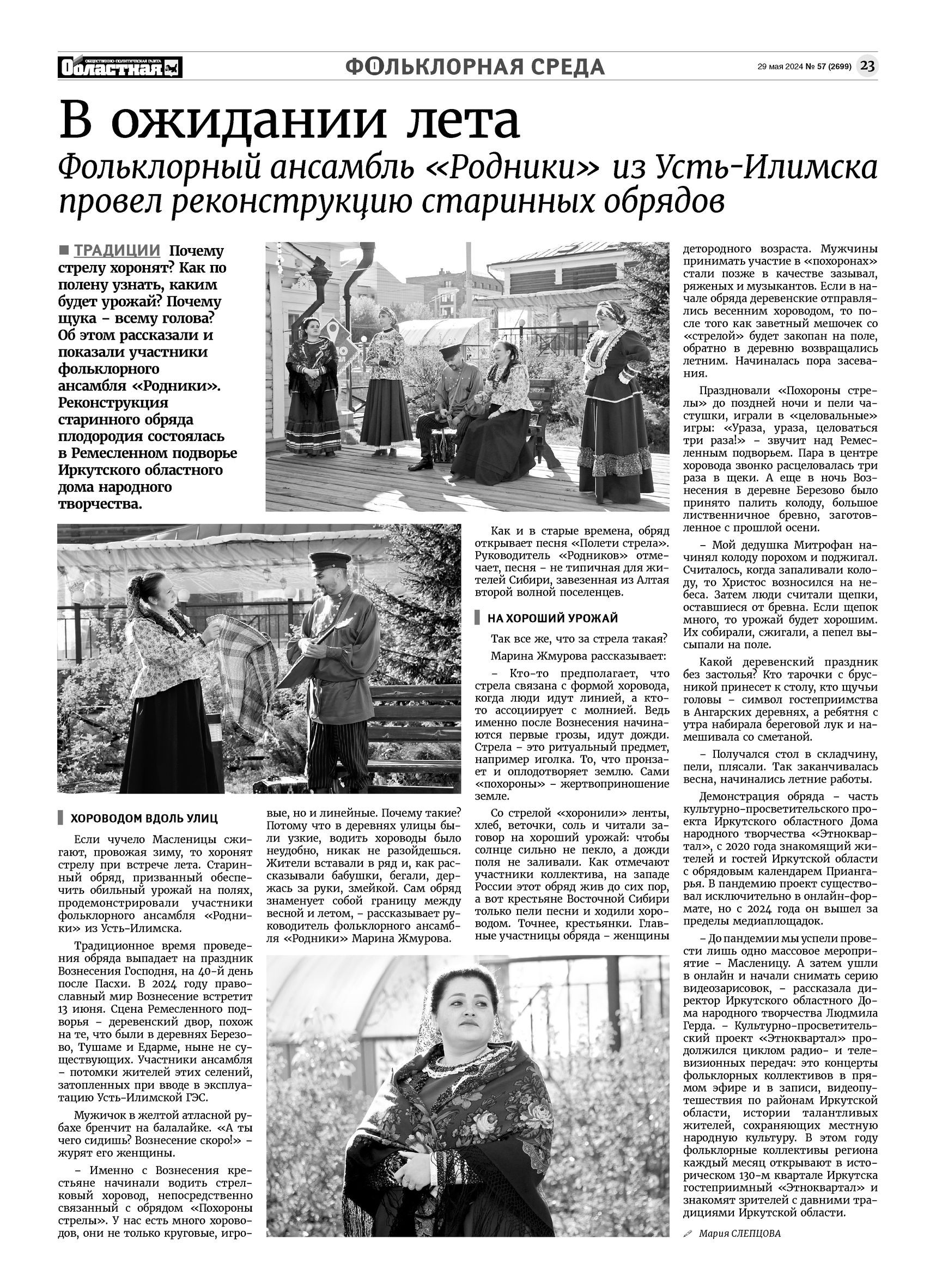 В публикации «В ожидании лета» журналист описывает, как фольклорный ансамбль «Родники» из Усть-Илимска провел реконструкцию старинного обряда на плодородие земли и богатый урожай. Почему стрелу хоронят? Как по полену узнать, каким будет урожай? И почему щука – всему голова? Ссылка на материал: https://www.ogirk.ru/2024/05/29/v-ozhidanii-leta-2/