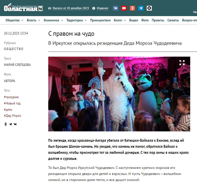 Подробнее: С правом на чудо. В Иркутске открылась резиденция Деда Мороза Чудодеевича