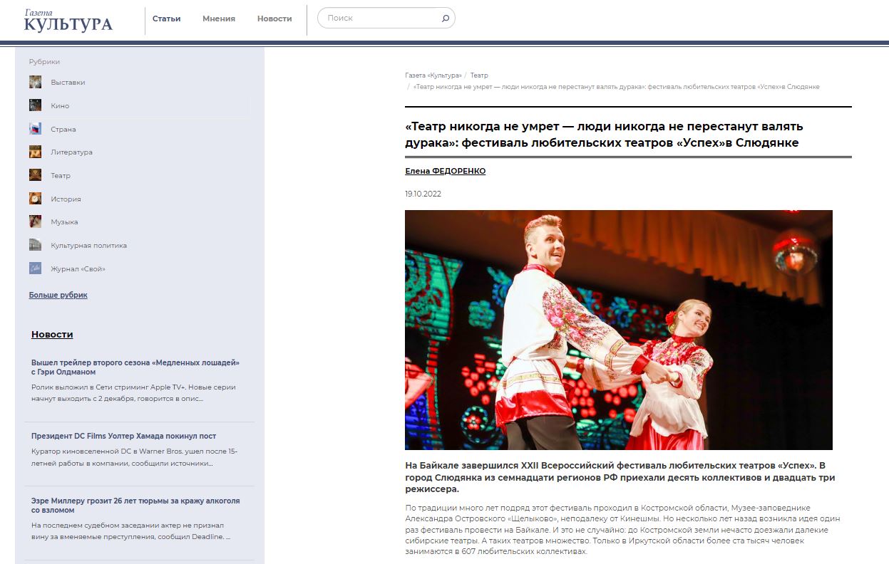 В федеральной газете «Культура» вышла статья члена жюри, театроведа Елены Федоренко о всероссийском фестивале-любительских театров, который состоялся в конце сентября в Иркутской области