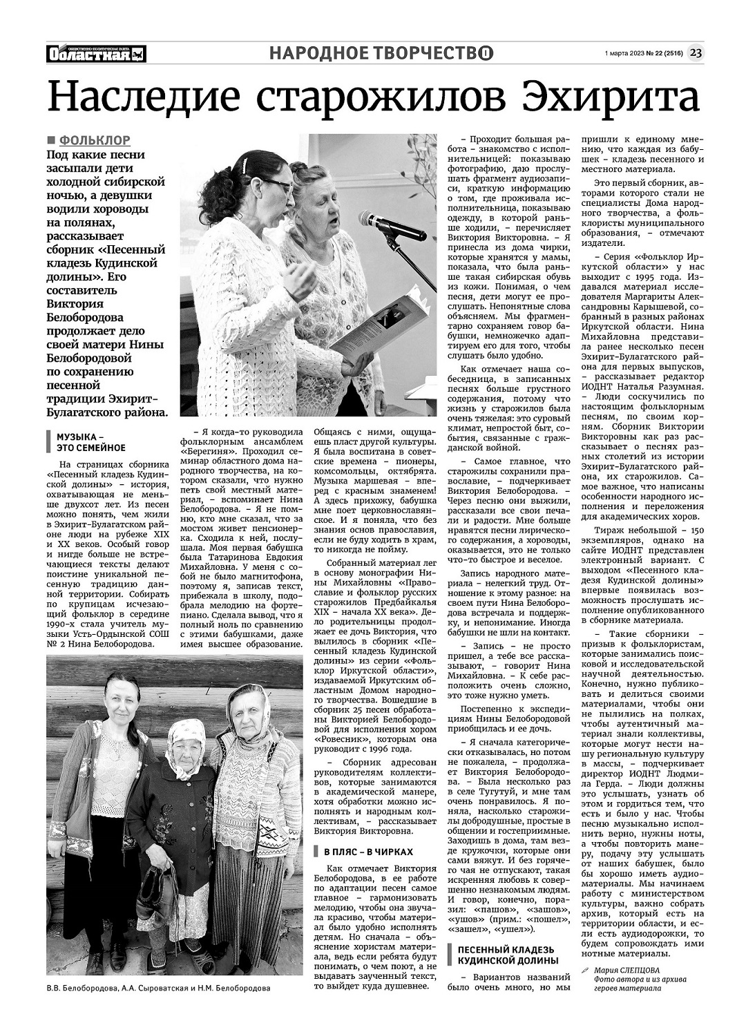 Под какие песни засыпали дети холодной сибирской ночью, а девушки водили хороводы на полянах, рассказывает сборник «Песенный кладезь Кудинской долины». Его составитель Виктория Белобородова продолжает дело своей матери Нины Белобородовой по сохранению песенной традиции Эхирит-Булагатского района. Иркутский областнной Дом народного творчества издал этот сборник 15-м в серии "Фольклор Иркутской области"