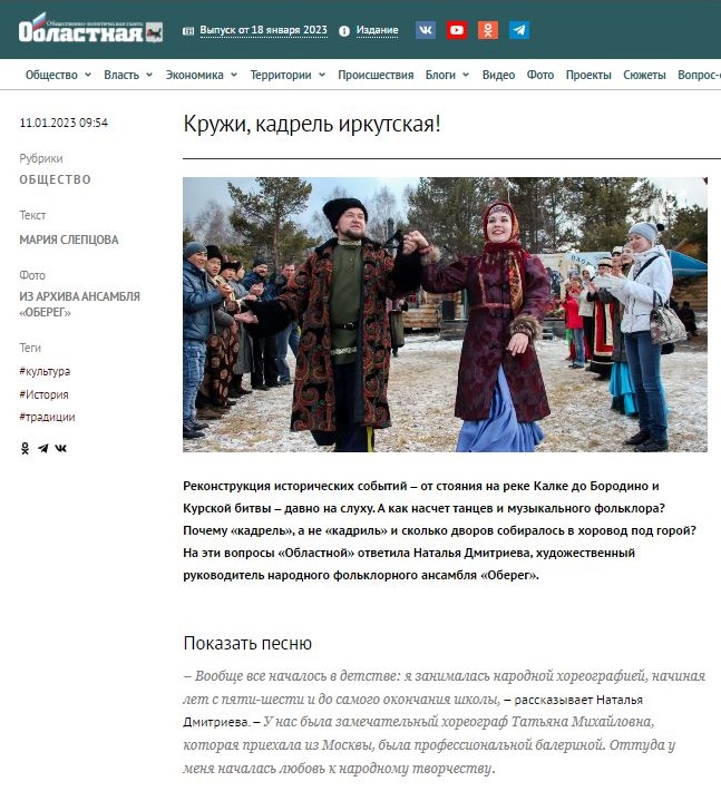 Реконструкция исторических событий – от стояния на реке Калке до Бородино и Курской битвы – давно на слуху. А как насчет танцев и музыкального фольклора? Почему «кадрель», а не «кадриль» и сколько дворов собиралось в хоровод под горой? На эти вопросы газеты «Областной» ответила Наталья Дмитриева, художественный руководитель народного фольклорного ансамбля «Оберег».