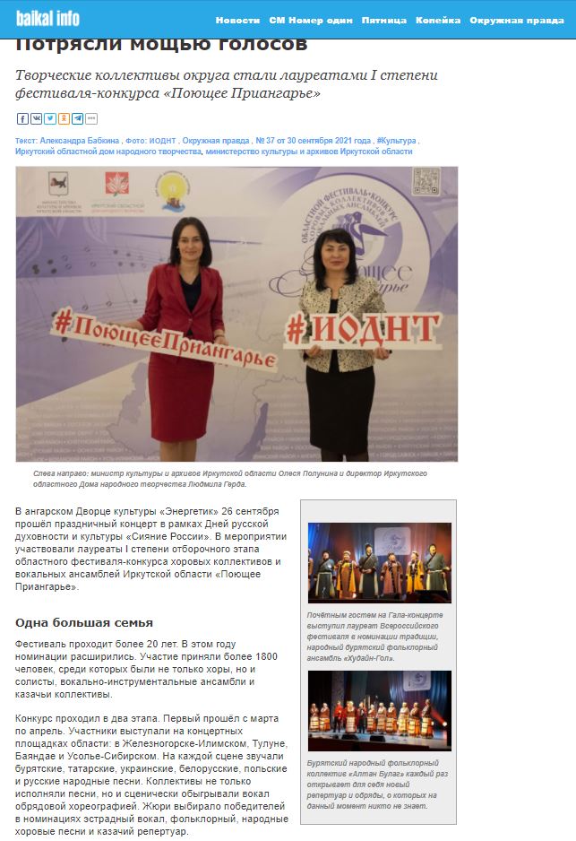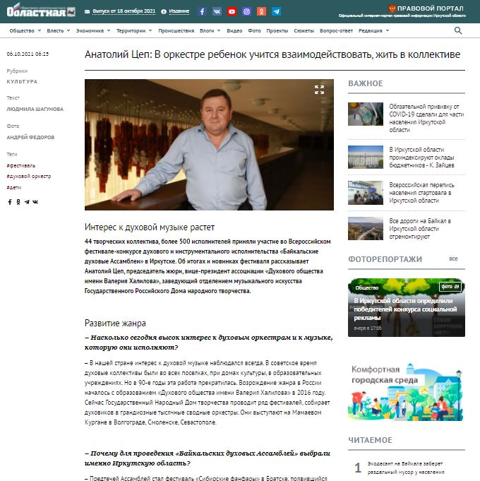 Статья в газете "Областная" об итогах и новинках Всероссийского фестиваля «Байкальские духовые Ассамблеи». Рассказывает Анатолий Цеп, председатель жюри, вице-президент ассоциации «Духового общества имени Валерия Халилова», заведующий отделением музыкального искусства Государственного Российского Дома народного творчества.