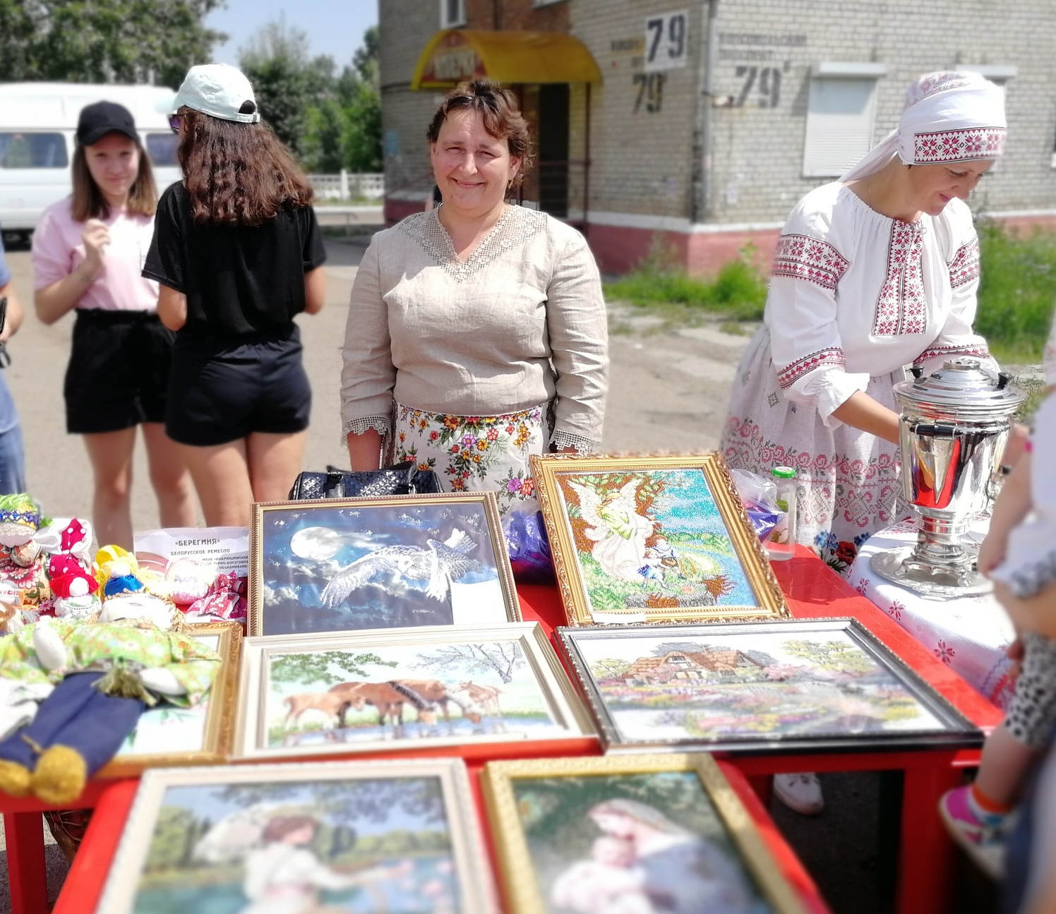 Они выступили с композициями «А у садзерэчанька», «Ты квiтней мой сад». Руководитель коллектива – Третьякова Наталья Петровна. В это времяВелисевич Ирина Викторовна, руководительтворческого объединения «Берегиня»,на площадке «Белорусское ремесло»представилакартины в технике «бисер», «вышивкакрестом» и представила куклы-обереги. Дети с интересом приняли участие в мастер-классе по изготовлению кукол-оберегов, выбирали лоскутки ткани, нитки, ленты. Ребятаостались довольны, получили новые знания, опыт и яркие впечатления.На тематической площадке «Смачны стол» прошла дегустация национальной белорусской кухни и конкурс на лучшее оформление стола. Наш белорусский коллектив стал победителем.Все участники были награждены дипломами и памятными подарками.