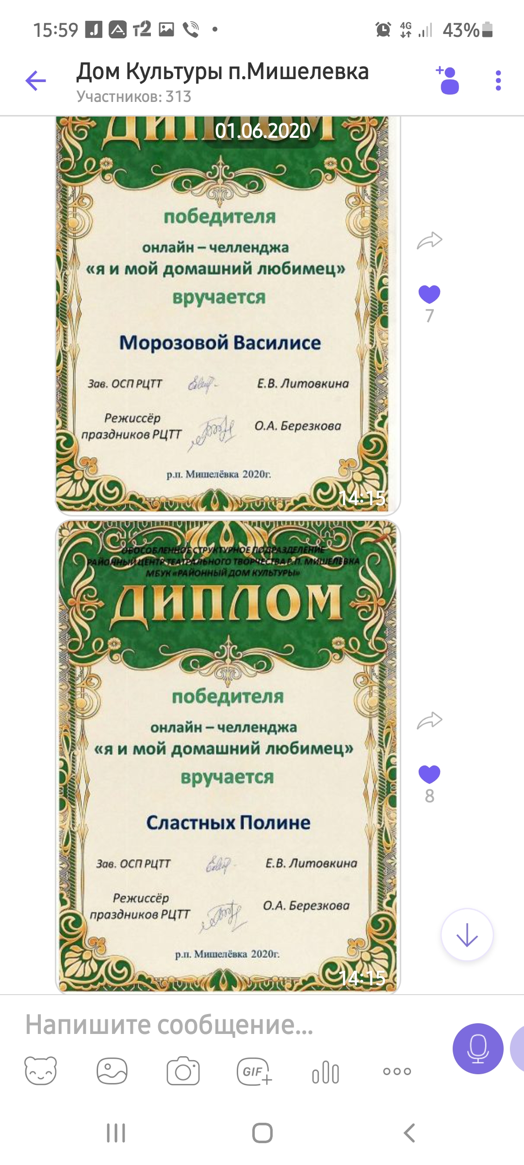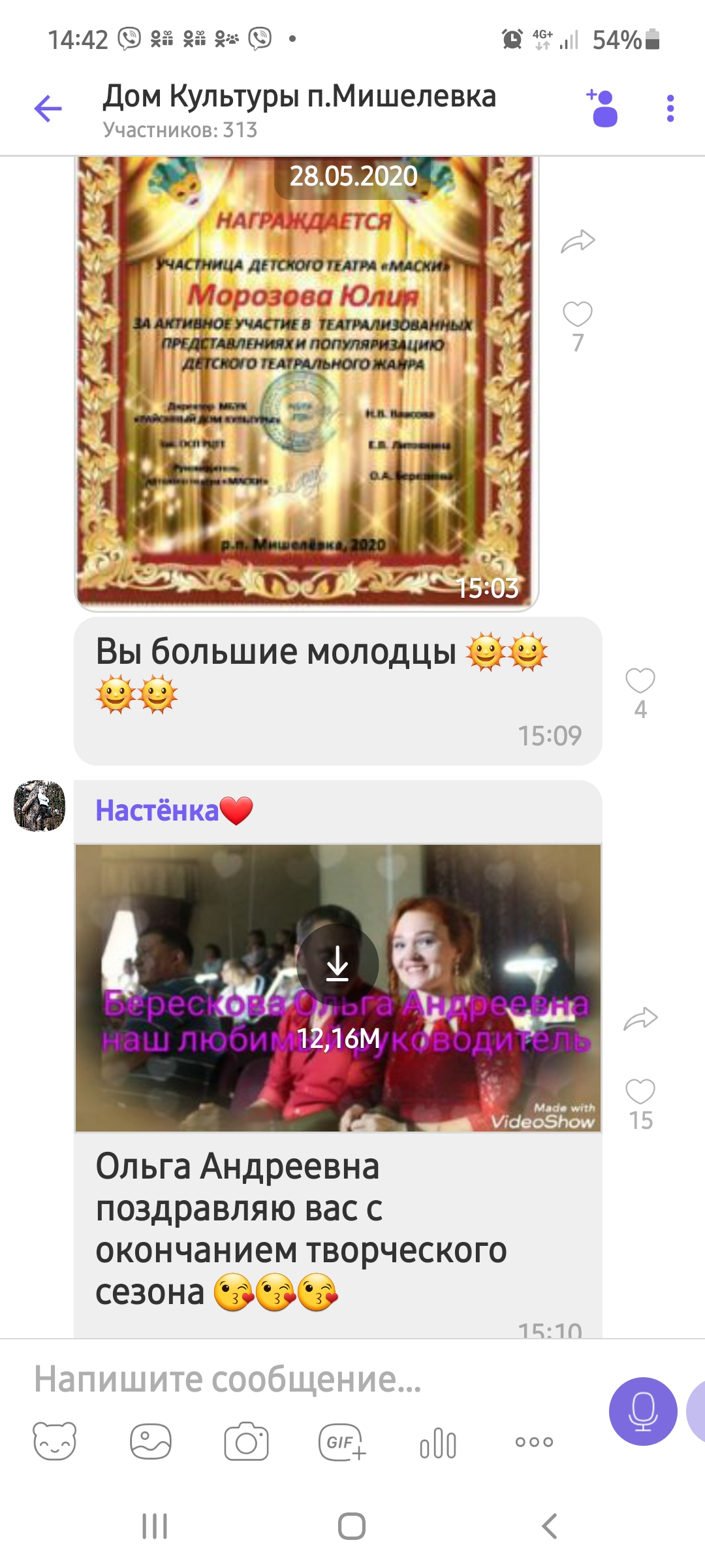 Всего в течение Недели Детства было проведено 37 онлайн-мероприятий. Охват целевой аудитории сообщества Дома Культуры, мессенджер-приложения Viber, составил 314 человек. На его страницах дипломами и благодарственными письмами были награждены самые активные участники детских творческих коллективов, всего 82 человека. Сами дипломы и сладкие призы дети смогут получить от волонтёров или предварительно созвонившись во дворе учреждения, соблюдая масочный режим и дистанцию. Вот такой получился праздник для детей в этом голу.