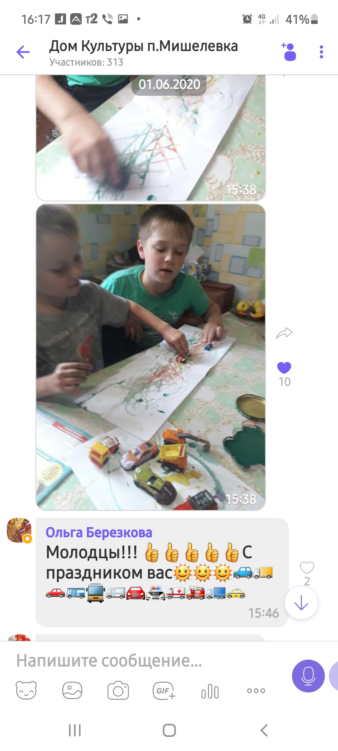 Завершилась неделя детства 1 июня онлайн-праздником «Этот мир мы дарим детям». В онлайн-рубрике «Хроноскоп» была размещена информация об истории праздника, его главном символе, актуальности проведения. Затем были подведены итоги всех конкурсов. В онлайн-конкурсе рисунков «Солнечный зайчик» приняли участие 28 ребят от 4 до 12 лет. Решением конкурсной комиссии было определено три победителя. Диплом I степени получила Донченко Екатерина, диплом II степени достался Валянину Егору, а диплом III степени – Слайковской Арине. Победителями онлайн-челленджа «Я и мой домашний любимец», в котором приняли участие 29 человек, стали: Василиса Морозова, Ангелина Слайковская и Полина Сластных. В конкурсе видеозарядки «Бодрячок» приняли участие четыре ребёнка в возрасте 4–5 лет: Егор Герасимов, Сластных Полина, Донченко Юля и Туров Роман. Все ребята были отмечены дипломами участников от Районного центра театрального творчества. Лучшие работ и дипломы были опубликованы на странице мессенджера.
