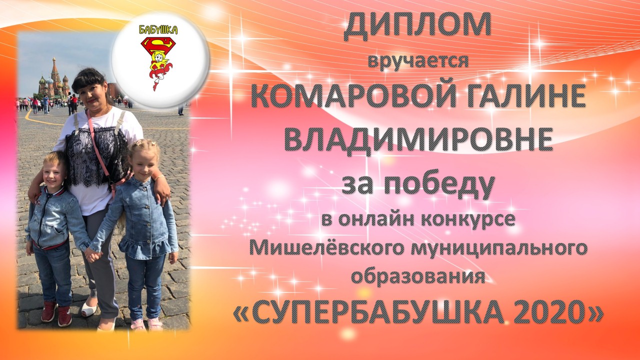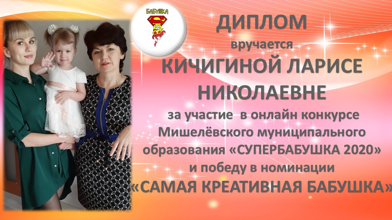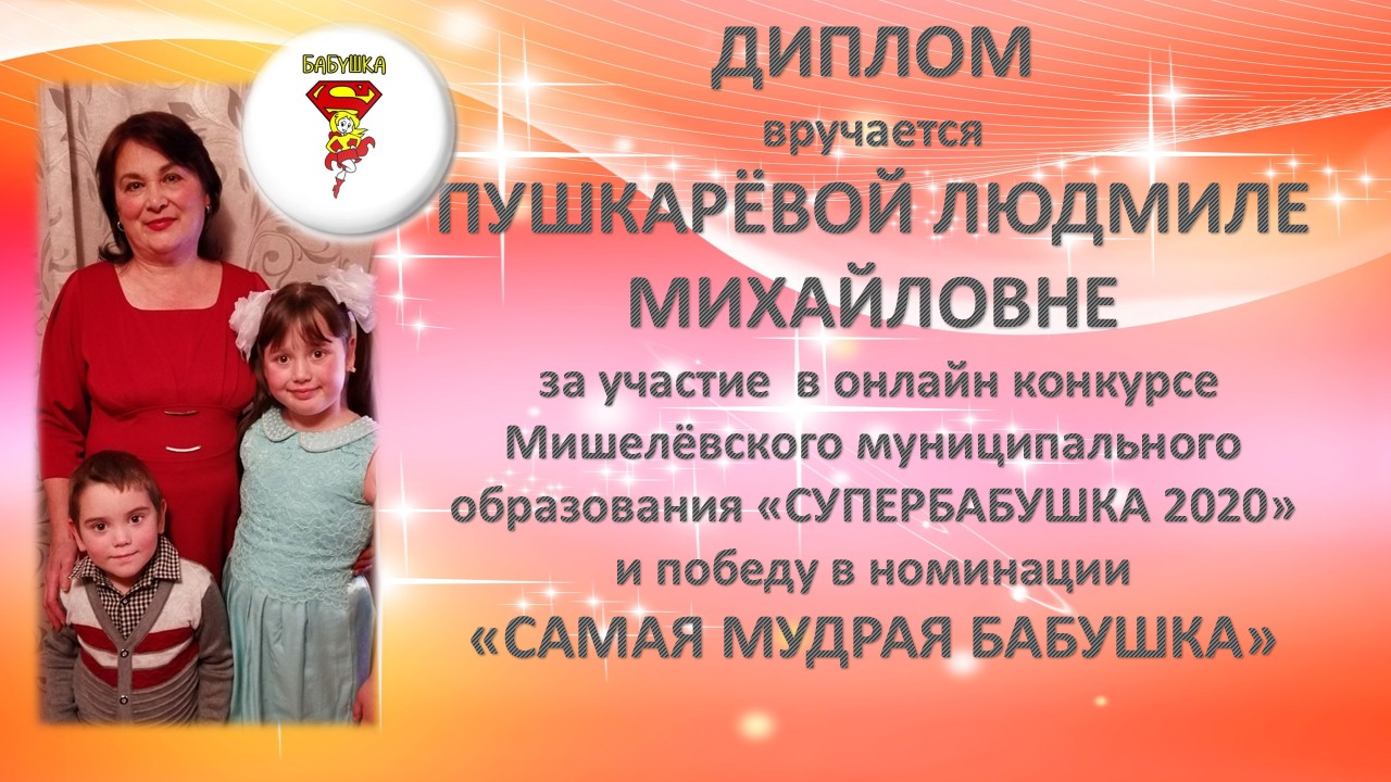 Звание «Супербабушка – 2020» было присуждено Комаровой Галине Владимировне. Пушкарёва Людмила Михайловна стала победительницей в номинации «Самая мудрая бабушка», Кичигина Лариса Николаевна – «Самая креативная бабушка», Лямина Екатерина Юрьевна – «Самая заботливая бабушка». Все участницы были награждены дипломами и подарками, предоставленными Администрацией Мишелёвского муниципального образования, ООО Тепловая компания «Белая», Районный дом ремёсел п. Мишелёвка приготовил для каждой участницы именной подарок в виде фарфорового блюда, расписанного мастером Натальей Жадан, Районный центр театрального творчества в лице художника Екатерины Ивановой приготовили атмосферные памятные подарки: сувениры, АО «Родной Корпус» предоставил сладкие призы.