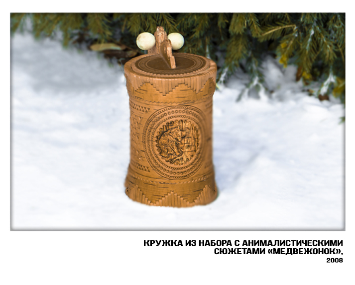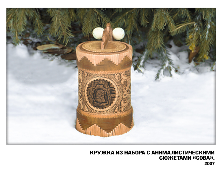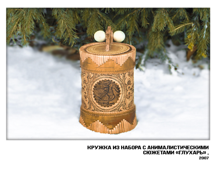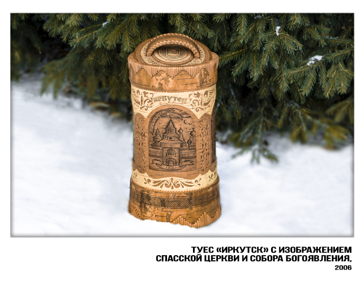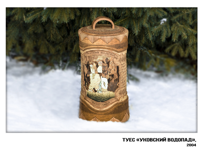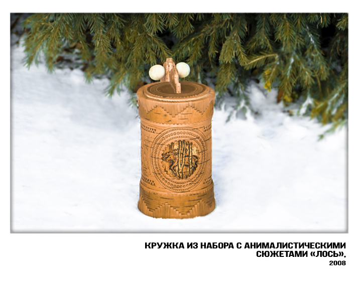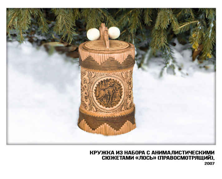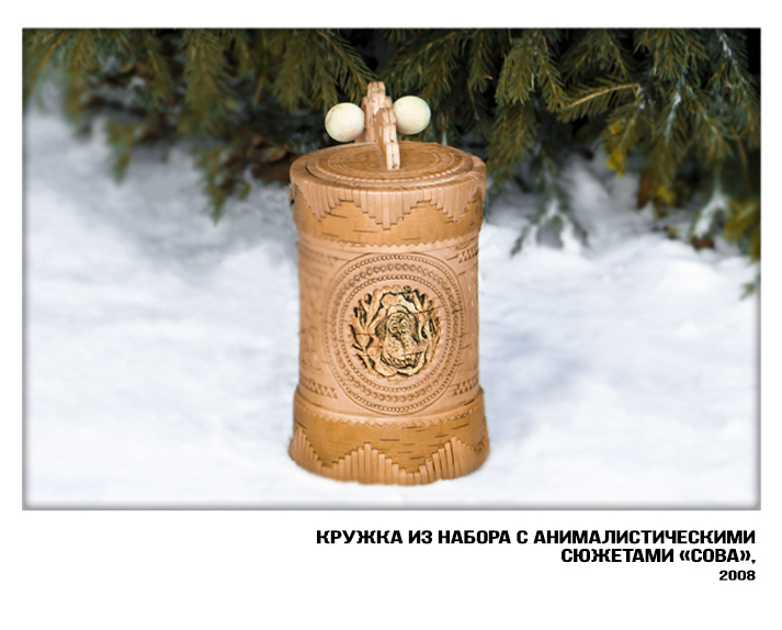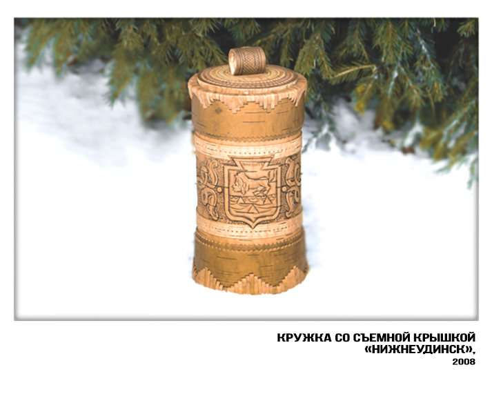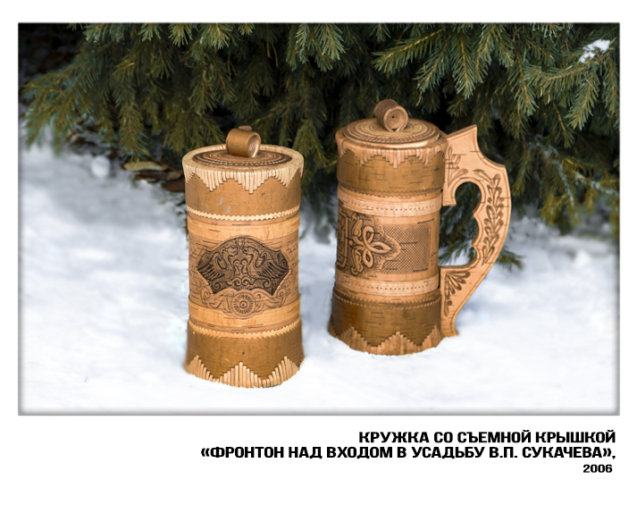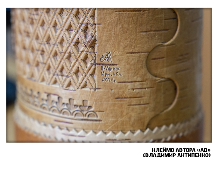 Уникальность работ Владимира Антипенко состоит в том, что в отличие от массово распространенных сувенирных поделок, выполняемых из одного слоя бересты встык, автор использует одну из наиболее сложных традиционных технологий работы с берестой, а именно изготовление емкостей из так называемого «сколота» или «сколотня». Для снятия сколота выбирается гладкий березовый ствол с минимальным количеством трещин, сучков и неровностей. Кора аккуратно отделяется от спила такого ствола и бережно снимается единым цельным полым цилиндром. В результате на стенках сосуда – туеса или кружки – не будет стыков, и его можно будет использовать в быту, в том числе и для хранения или сервировки жидкостей. Это очень кропотливая работа, т.к. из-за любого неосторожного движения сколот может повредиться в процессе снятия и все старания пойдут насмарку. Однако сколот становится только основой сосуда, первым слоем. Далее мастер декорирует сосуд многослойным берестяным прорезным орнаментом. Эта технология возникла в XVII – начале XVIII вв. Гармоничное колористическое решение создается за счет тонкой работы с тщательно подобранными оттенками бересты. Причем береста не окрашивается, а используются именно естественные цвета, палитра которых на удивление богата: от темно-серых, почти черных, через коричневые, золотистые, нежно-розовые тона приближаясь к совсем светлым. Отобранные пласты бересты накладываются на сосуд в несколько слоев, причем верхние слои прорезаются, чем создается сложный рельеф, дополнительно орнаментируемый стилизованным растительным узором, также выполненным вручную – в этом еще одно ключевое отличие от сувенирных поделок, как правило, декорируемых с помощью механической штамповки. Края кружек «прошиты» тонкими берестяным полосками – это и дополнительный авторский декоративный элемент, и защита края изделия от расслаивания в процессе использования. Наконец, главным украшением и авторской «изюминкой» произведений Владимира Антипенко является оформление изделий резными панно также ручной работы. Сюжеты панно разнообразны: от памятников иркутской архитектуры до пейзажей Нижнеудинского района. Они выполнены на более темной бересте и включены в декор изделий в виде медальонов сложной формы, для которых верхние слои светлой бересты служат своего рода обрамлением.