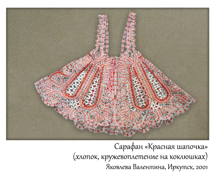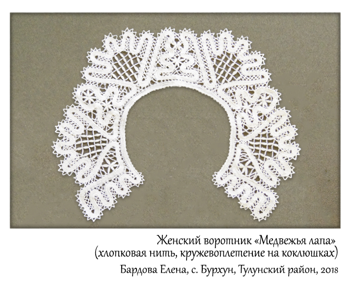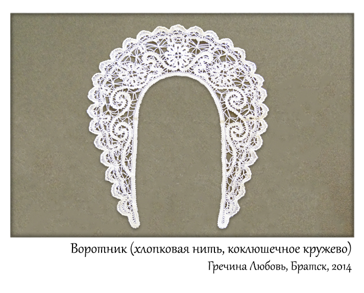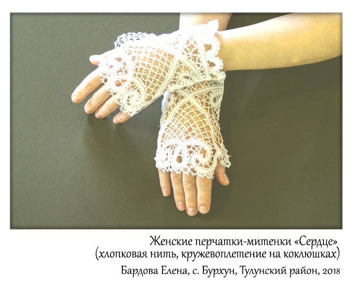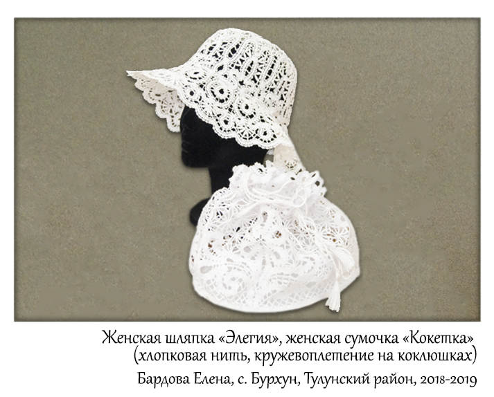 Работы Любови Гречиной из Братска наиболее классические по форме. Они представлены салфетками, дорожками, воротниками, т.е. теми предметами, которые всегда составляли «ядро» русских кружевных традиций. Елена Бардова из с. Бурхун Тулунского района обращается к теме женских кружевных аксессуаров – шляпок, перчаток-митенок, ажурных сумочек. Эти предметы, вошедшие в моду еще в XIX в., сохраняют свою актуальность до сих пор, развиваясь вместе со сменой стилей и направлений, и обеим мастерицам вполне удается придать классическим элементам современное «звучание».